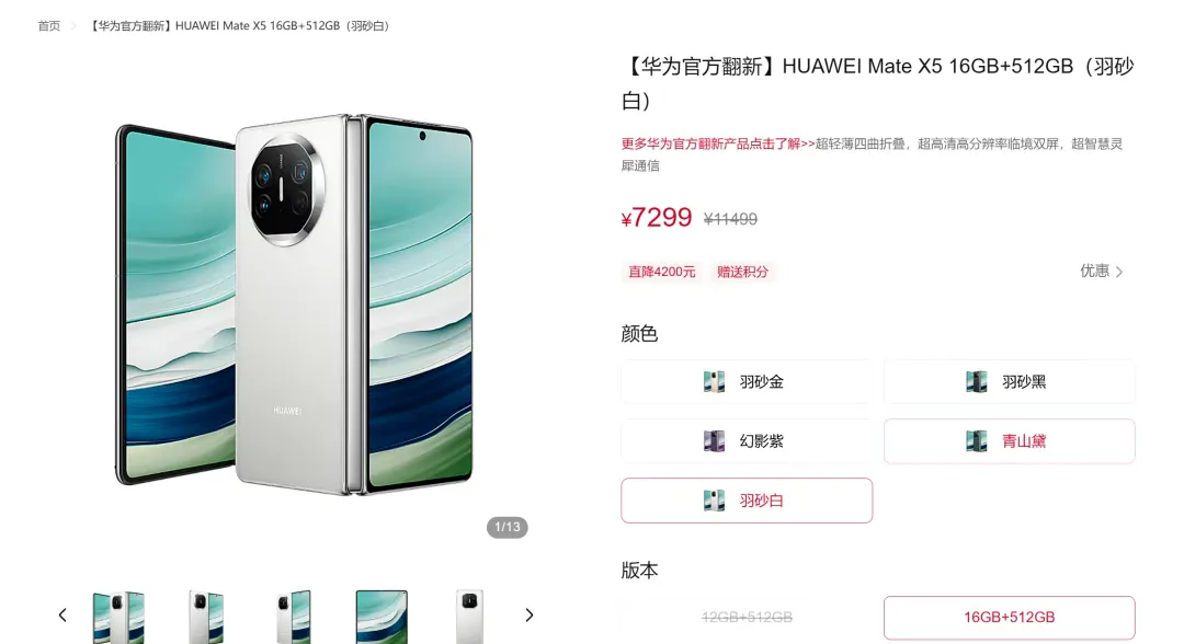 尤其是MateX5,12GB+512GB首发价格为14999元,而如今刚上的官翻机降到了7299元,差不多打了5折,这个价格还是很划算的,后悔Mate X7买早了。
