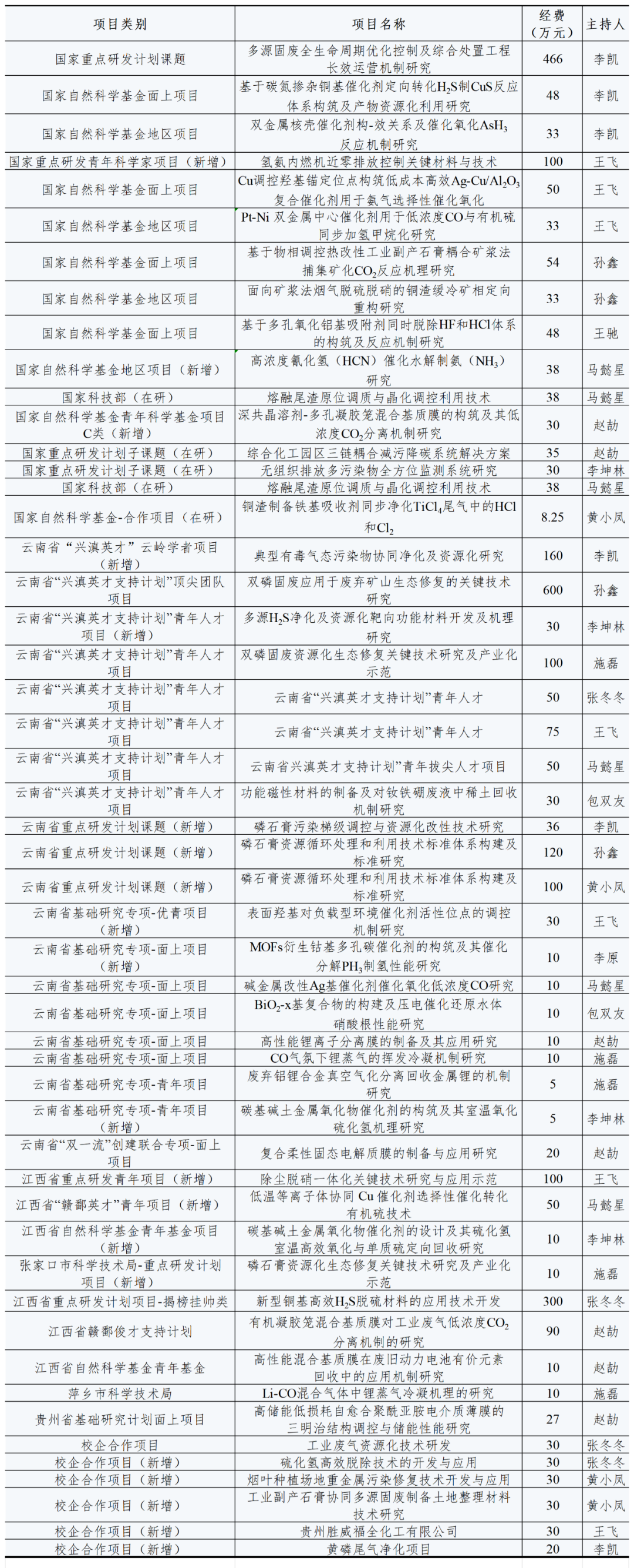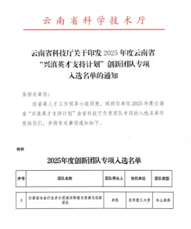 2025 年,团队入选云南省“兴滇英才支持计划”创新团队专项,成立云南省冶金化工行业多介质减污降碳与资源化创新团队。同时团队获批建设云南省磷石膏资源循环与生态利用重点实验室,李凯教授和孙鑫教授分列实验室主任和副主任。在依托昆明理工大学环境工程国家重点(培育)学科、冶金及化工行业废气资源化国家地方联合工程研究中心等优质平台的基础上,为科研创新提供更加坚实的保障。