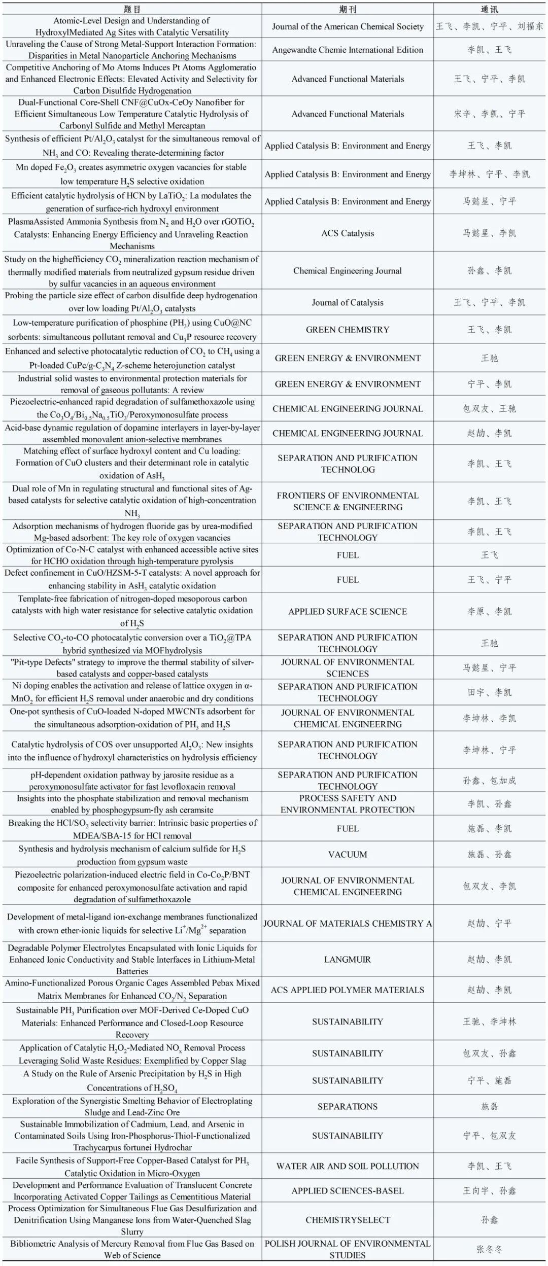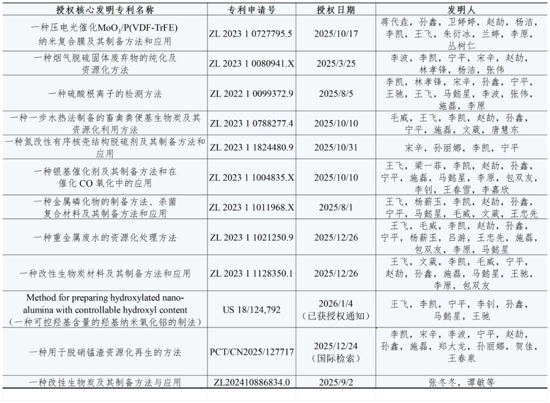 2025 年,团队持续强化核心技术自主创新,新增授权发明专利 12 项,其中包含 1 项美国发明专利,技术覆盖催化剂制备、污染物净化、固废资源化等关键领域,多项专利已通过技术许可、转让等形式落地转化,让创新成果真正 “走出实验室、走进生产线”。表3 代表性授权专利
