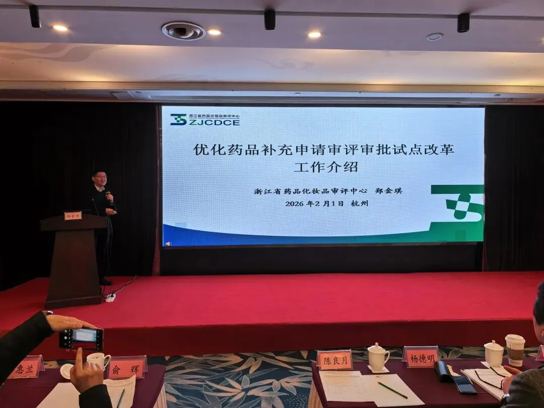 随后,会议进入专题报告与交流环节。省药品化妆品审评中心副主任郑金琪详细介绍了浙江省作为首批国家药监局优化药品补充申请审评审批改革试点的主要工作成效。该试点旨在通过国家与省级联动,提升审评能力与服务产业效能。浙江省作为首批10个试点省份之一,由省局主要领导挂帅成立专项领导小组,组建专业团队,落实国家药审中心(CDE)对审评审批改革试点工作的管理要求,2025年取得了显著成效:2025年接收相关品规83个,平均审评用时从200个工作日的要求缩短至52个工作日,浙江省荣获了国家级优秀团队称号。未来,浙江将继续深化境内境外补充申请改革,优化服务模式,助力产业创新升级高质量发展。