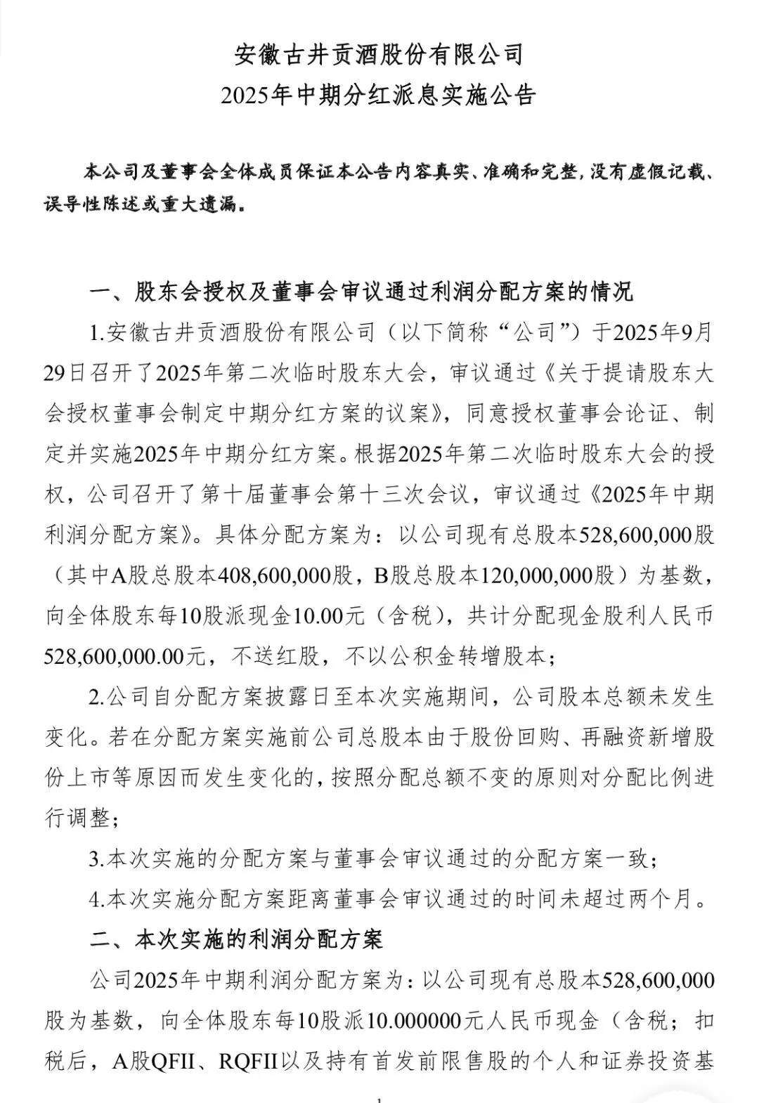 根据分红派息实施公告,古井贡酒此次分红以公司现有总股本5.286亿股(其中A股4.086亿股、B股1.2亿股)为基数,向全体股东每10股派发现金红利10元(含税),不送红股、不进行公积金转增股本,总派现金额达5.286亿元。