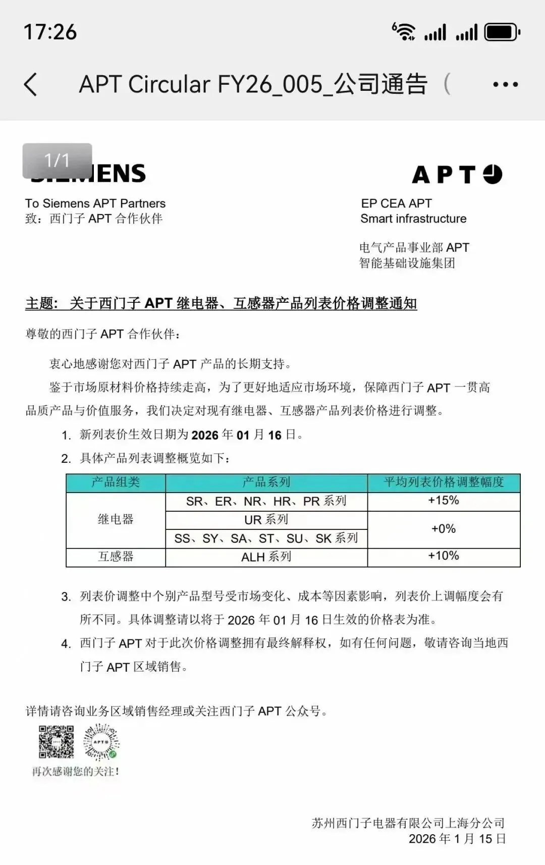 | | | | 原材料成本上涨,2026 年 1 月 1 日起执行 |