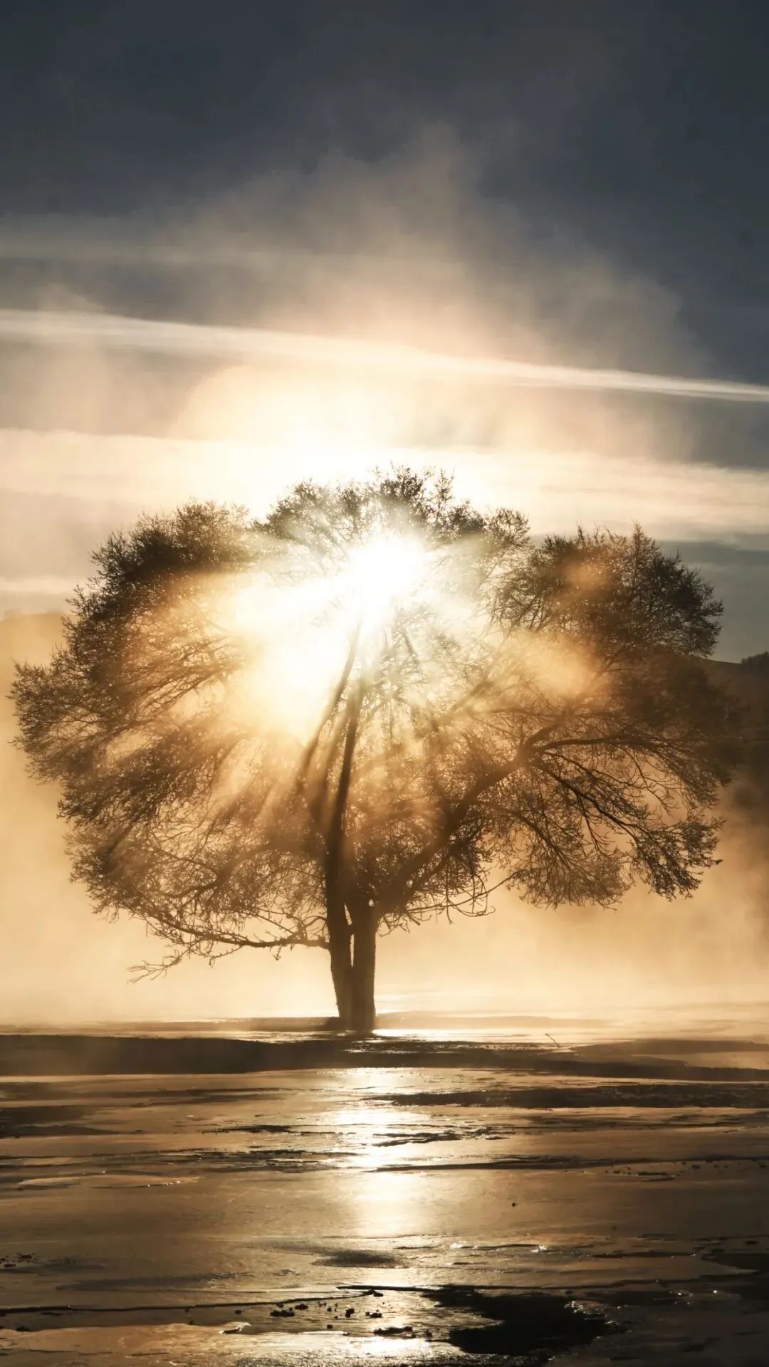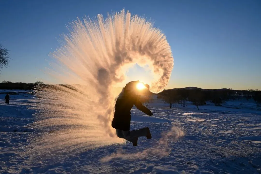 清晨时分,当第一缕阳光穿透薄雾,暖水河便化身为"魔界"仙境。河面上蒸腾起袅袅雾气,如同轻纱般笼罩在冰面之上,随着太阳升起,雾气逐渐散去,露出晶莹剔透的冰面。此时,两岸的白桦树枝上挂满了雾凇,像是被精心雕琢的水晶艺术品,在阳光照射下闪烁着梦幻般的光芒。
