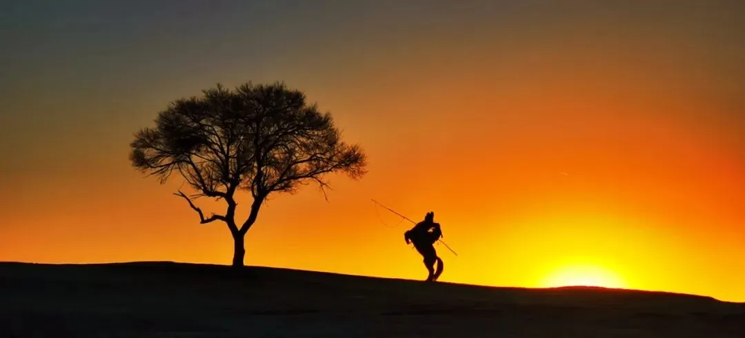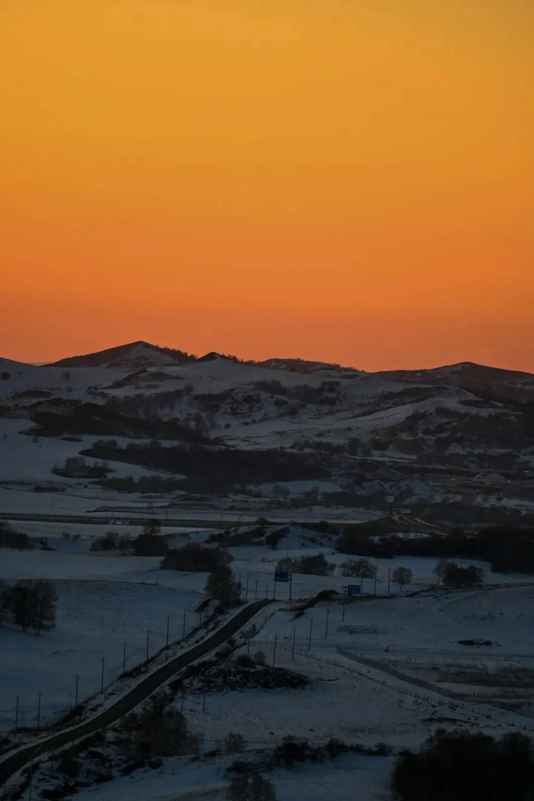 骆驼峰是《狼图腾》的取景地,也是乌兰布统的唯一高点,可360度俯瞰乌兰布统连绵起伏的丘陵地貌。骆驼峰在暮色中矗立,积雪覆盖的草原延伸至天际。夕阳西沉,将最后的光芒洒向银白世界,雪地反射着橙红与紫蓝,天空由青灰渐变为深邃的蓝紫。
