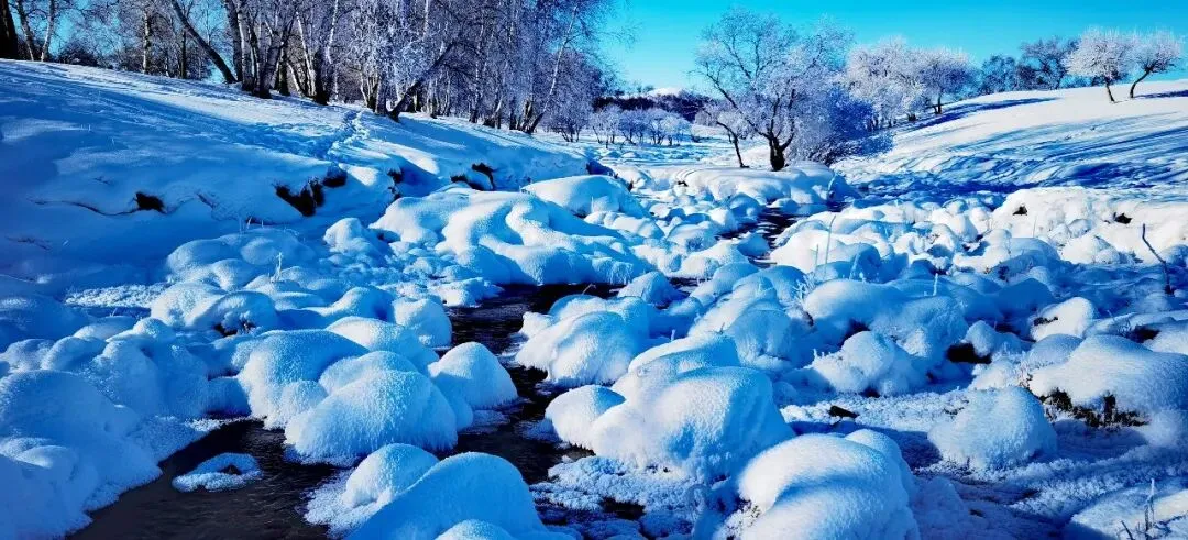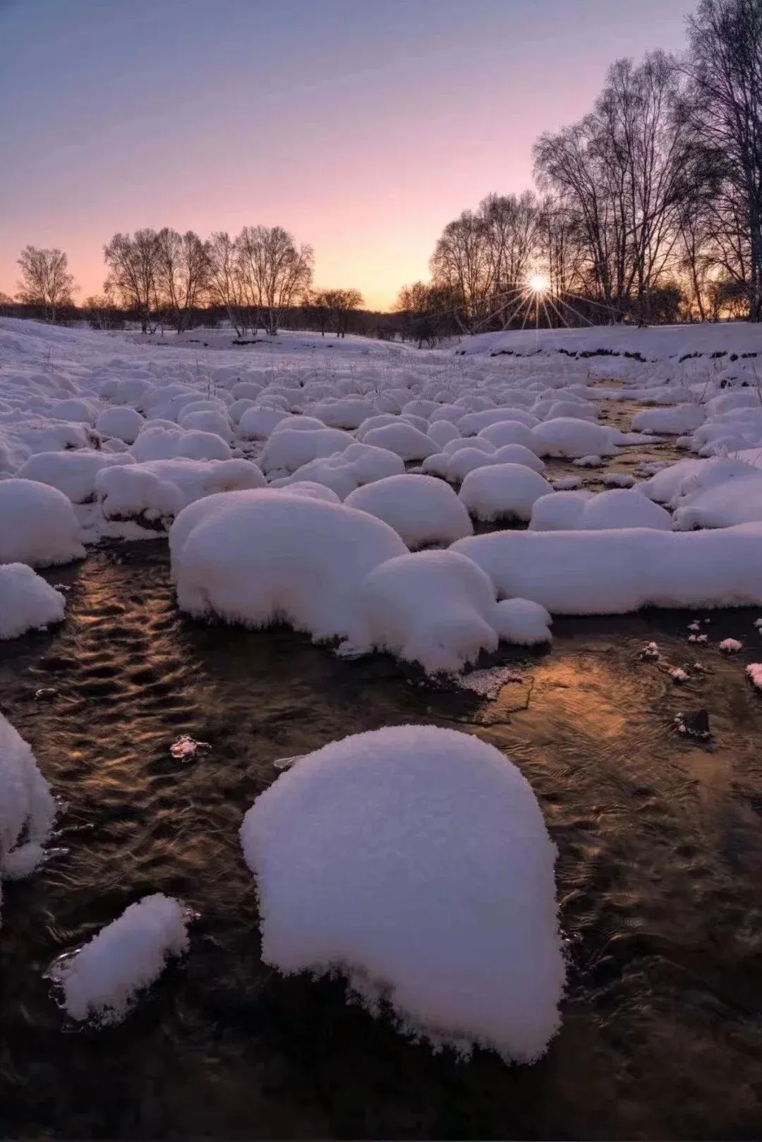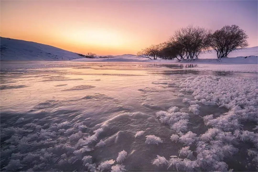 在-20℃的严寒中,暖水河依然潺潺流淌,日出时分水汽蒸腾,烟雾缭绕,河面与雪原交织成一片迷蒙的仙境。雾气落在两岸的白桦枝头,凝结成晶莹的雾凇,仿佛大自然亲手雕琢的水晶艺术品。此时捧起一壶沸水泼向天空,瞬间化作漫天冰雾,成为社交媒体上爆火的打卡项目。