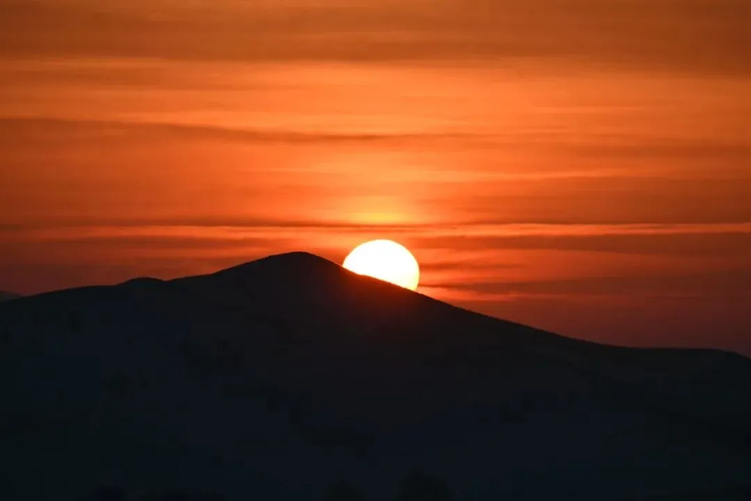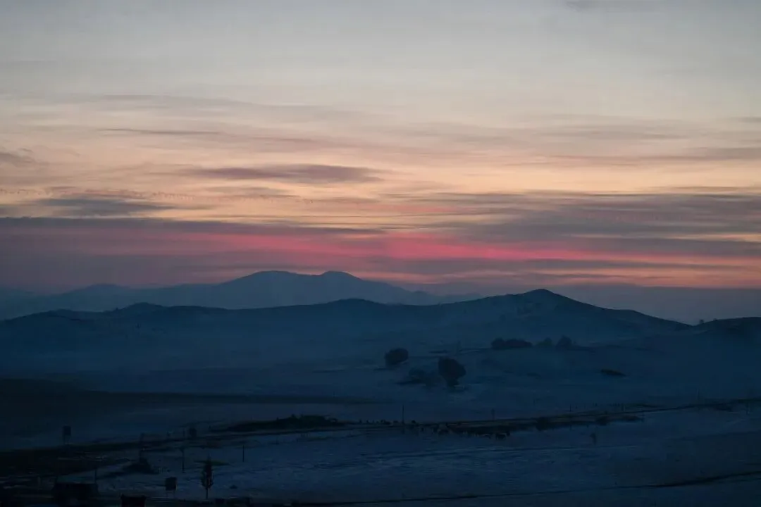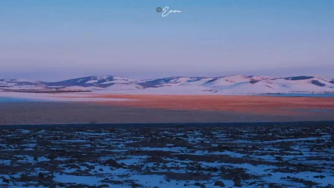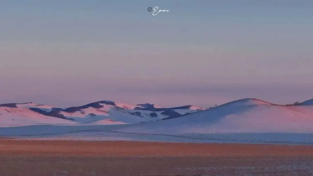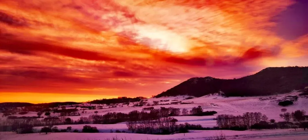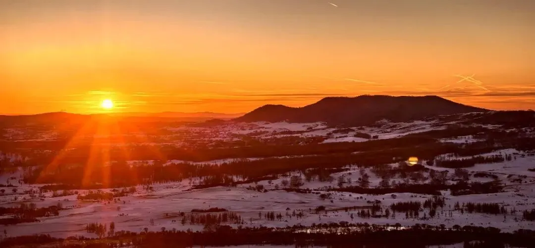 当傍晚来临,敖包图已迎来一天中最美丽的时刻。站在敖包图山前的高地上,眼前是无垠开阔的景观,雪原与连绵起伏的山丘,它们在夕阳中由暗红渐变为金红,层次分明 。若遇平流雾天气,将军泡子与小红山在雾中若隐若现,宛如仙境 。此时的天空上演着色彩的魔术,从深邃的靛蓝到柔和的粉紫,再到温暖的橘红,最终被朝阳染成一片金黄。