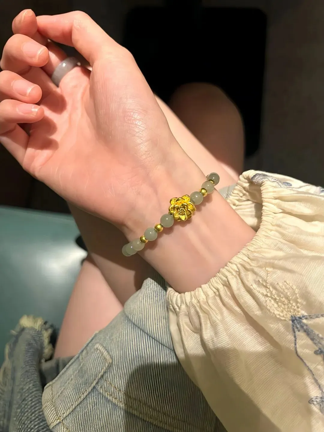 其实我就是耐不住手痒,直接拿下了这条金翠拼接的手链!先跟你们报个参数,主角当然是这个3.1克的足金立体花朵,整体搭配14颗冰翠圆珠,加几颗迷你金珠穿插,工艺是细腻到爆的失蜡立体浮雕,哑光和抛光结合,花瓣层层分明,细节直接封神。整条手链成品克价当天下探到562元/克,门店标准价减去活动优惠,换算下来整条手链我到手1750块出头!就是那种真的一夜跌回年初的感觉,不冲完全对不起自己。颜色真的清新,金的部分是自然暖金,翠珠是带点柔灰的淡绿色,显白不挑肤色,配夏天的衣柜真的是一绝。