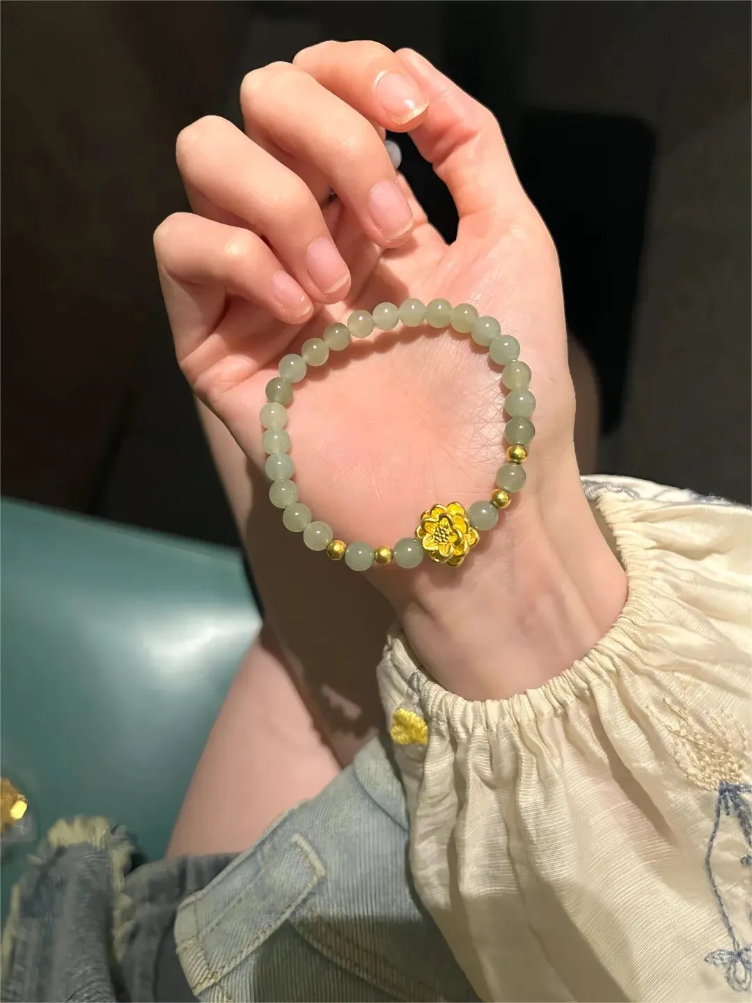 我其实有点事先担心弹力绳会不会容易松,但问了店员小姐姐,她说珠串这几年工艺升级了,都是加固尼龙线穿珠,不用天天换。平时只要不剧烈拉扯就可以安心戴。而且金花部分是中空结构,轻盈得很,3.1g戴着完全无负担,日常赶地铁写字都不会有磕碰感。唯一注意点就是金饰不要和香水、洗洁精一类的化学品混在一起,我习惯每天晚上用绒布擦一擦,珠玉部分用清水冲冲,保养超级省心。