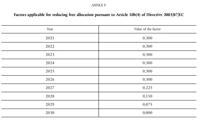 根据规则,2021年至2030年期间,欧盟碳市场EU ETS免费配额递减至0,如下图: