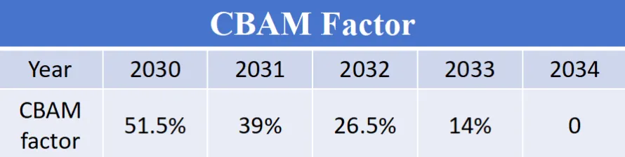 以72011011:非合金生铁为例,2025年其免费配额为1.089 tCO2e/t(根据下表的CBAM系数粗算),2026年降至1.062tCO2e/t,到2034年将完全取消免费配额,企业需为全部实际排放付费。