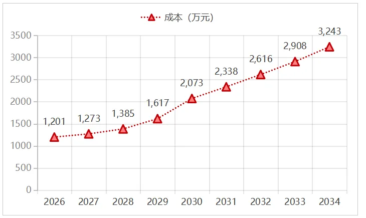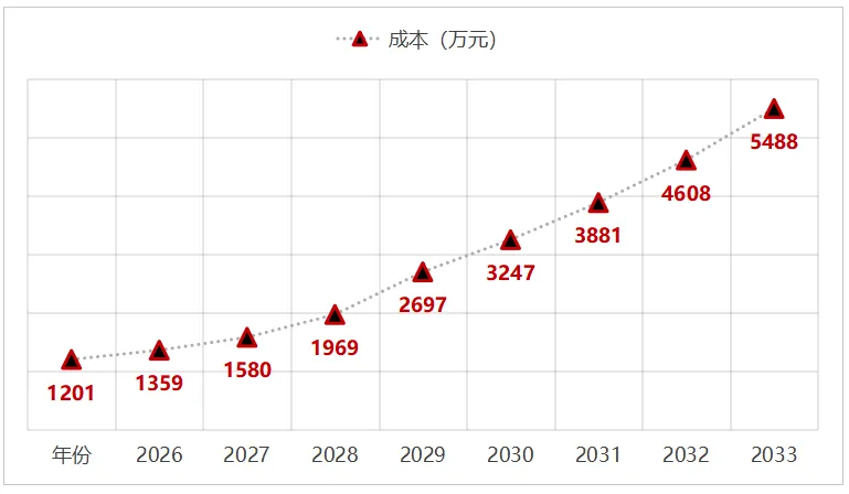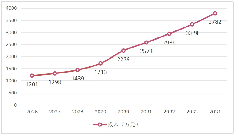 5%的中等增长场景下,成本增幅进一步扩大。2026年总成本同样为1200.9万元,2028年即突破1700万元,2030年达到2239.1万元,2034年攀升至3782.3万元,较初始年份增长214.9%。值得注意的是,2029年至2030年期间成本增速明显加快,这一阶段免费配额从0.844 tCO2e/t骤降至0.561 tCO2e/t,削减幅度达33.5%,成为成本跳涨的关键推手。