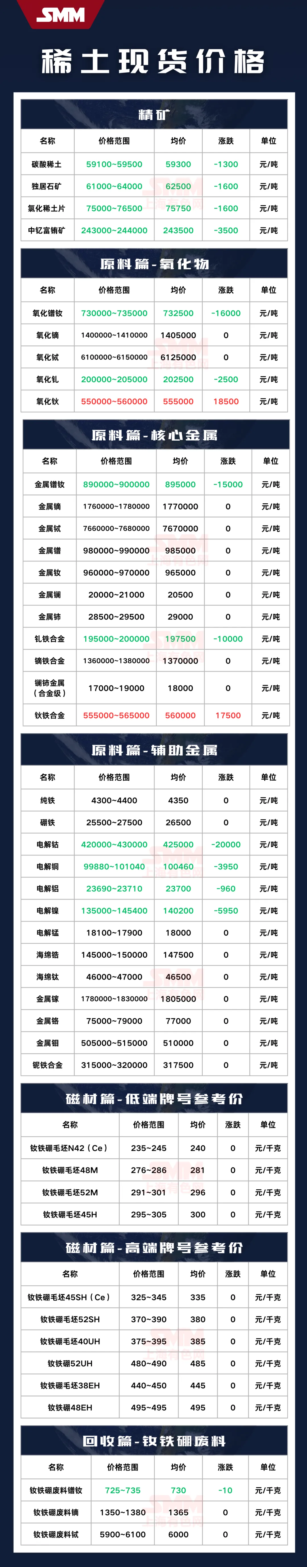 具体而言,氧化物市场方面,氧化镨钕价格下调至73-73.5万元/吨,氧化镝价格稳定在140-141万元/吨,氧化铽价格稳定在610-615万元/吨,氧化钆价格下调至20-20.5万元/吨;氧化钬价格上调至55-56万元/吨,氧化铒价格继续在39-39.5万元/吨之间波动。