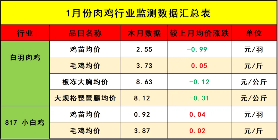 1月肉鸡均价呈先降后涨走势,1月上中旬毛鸡供应相对充足,产品走货一般,企业收购积极性不高,供需利空下,鸡价高位小降;下旬鸡病情况加重,山东等区域肉鸡死淘率加重,出栏小鸡情况多见,前期鸡源提前出栏透支后续鸡源供应,企业收购难度提升,产品端临近春节假期,走货顺畅,企业收购积极性随之提升,供需提振下,毛鸡价格持续上涨至月内高位,且月底山东等地区毛鸡实际收购过程中仍有加价操作,月下旬鸡价超预期上涨,进一步拉动月内毛鸡均价环比上行。