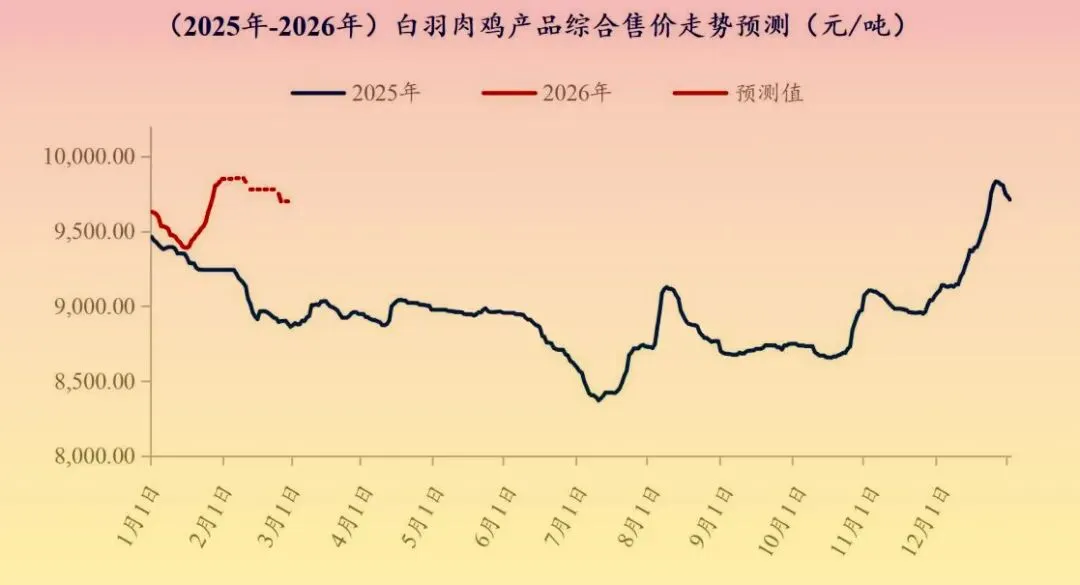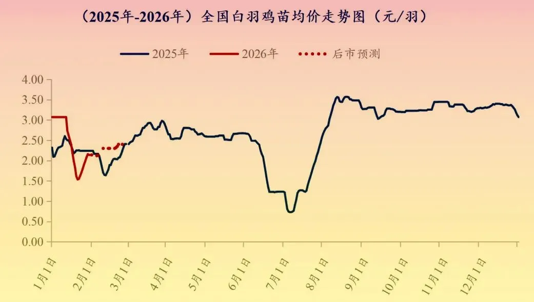 1月国内白羽肉鸡苗价格呈先跌后涨走势,月均价环比下跌。上旬孵化场多暂停出苗,市场几无成交,无主流成交价格,苗价延续2025年12月底的鸡苗成交价格;中旬孵化场陆续恢复出苗,鸡苗供应量低位增加,但养殖户多担忧后期出栏毛鸡时屠宰场暂未开工,补栏积极性不高,且议价情绪较重,孵化场排苗压力较大,临时计划量增多,鸡苗价格承压下跌;下旬孵化场出苗量处于高位,但由于毛鸡价格上涨,对鸡苗市场有提振作用,加之此时补栏鸡苗待毛鸡出栏时屠宰场陆续开工,因此中大型养殖场整体补栏积极性提升,孵化场排苗较为顺畅,推动鸡苗价格上涨。