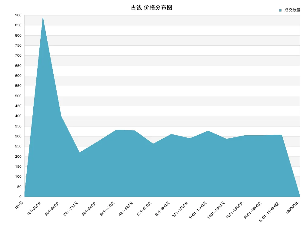 在古钱部分中,上周最低成交价为 120 元,最高价为 120000 元;依据总成交量,平均价格为 1737 元,但交易中最多的价格区间为 121-200元 内的藏品,价格中位数为 520 元,依据上周的最低价与最高价,低、中、高档藏品的价格分界分别为 240 元、 520 元、 1400 元。