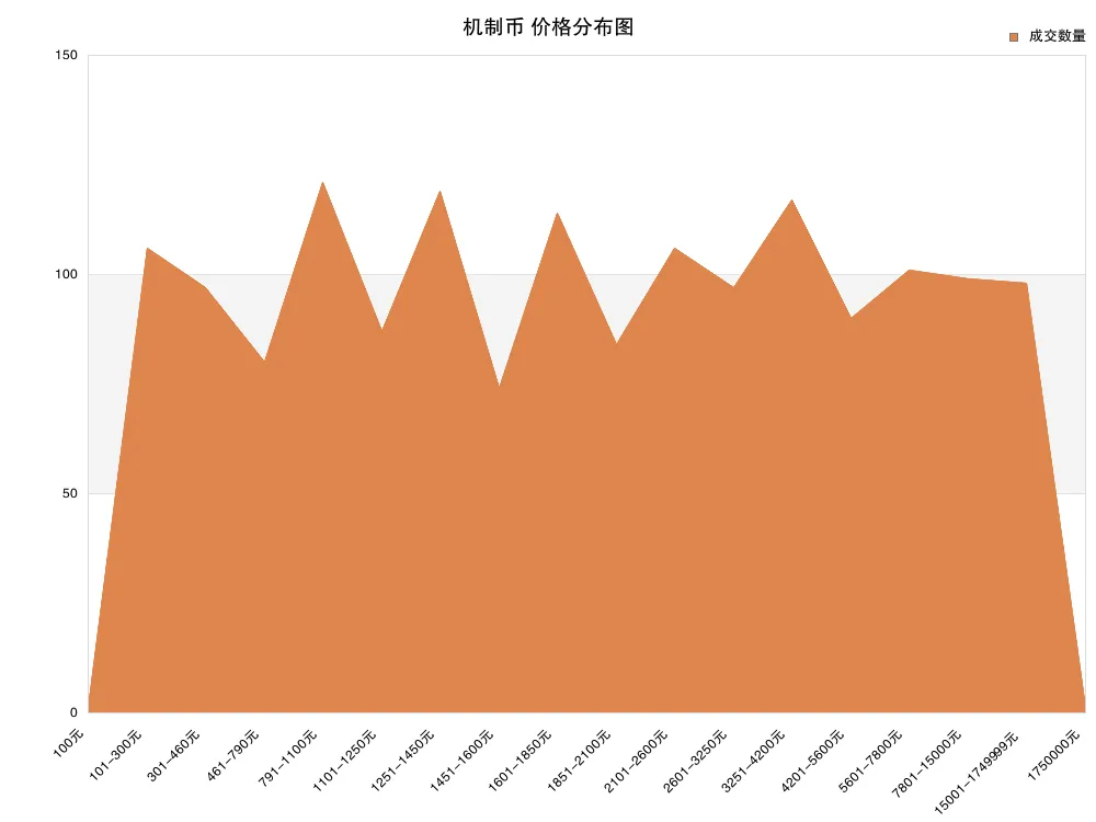 在机制币部分中,上周最低成交价为 100 元,最高价为 1750000 元;依据总成交量,平均价格为 10952 元,但交易中最多的价格区间为 791-1100元 内的藏品,价格中位数为 1850 元,依据上周的最低价与最高价,低、中、高档藏品的价格分界分别为 1100 元、 1850 元、 4200 元。
