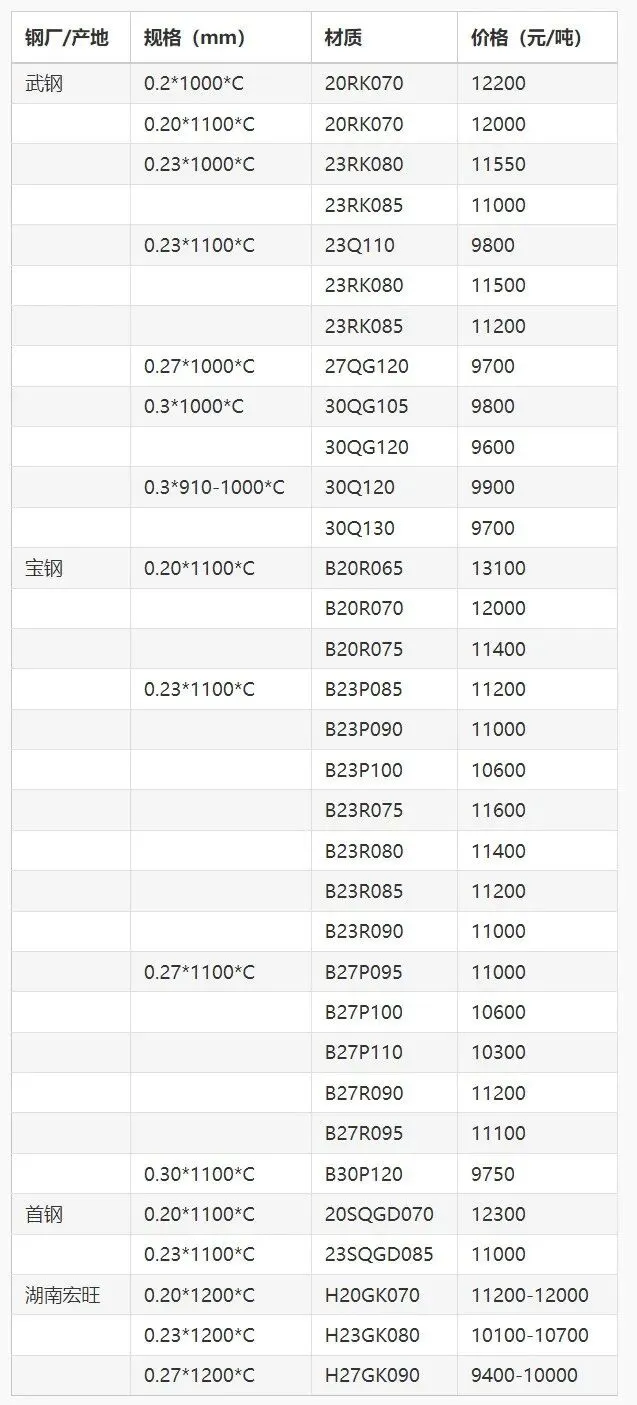 注:价格表只展示部分硅钢牌号价格信息,另外本平台提供国内、国外钢厂各种牌号硅钢订购服务,了解更多详情请进入本站官网。