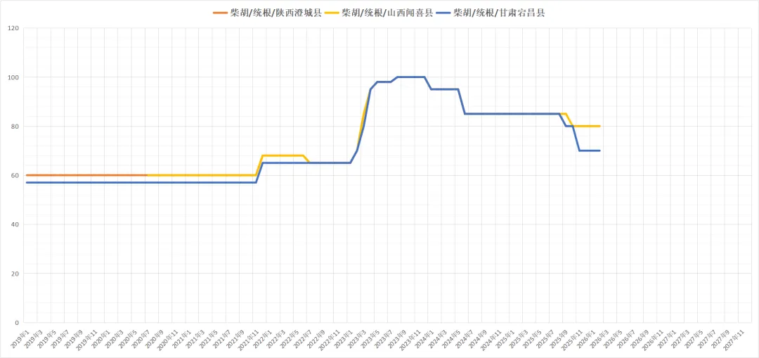 前期新货价格最低掉至22-23元,近来较多外地商家视低价积极采购,货源走动好转,行情出现回升,现可切片货从农户手中收购价在26元左右,上车价27元上下,药厂货现价22-23元,价涨后这两天商家的收购积极性有有所下滑。目前产区产新采挖已经结束,干货仍在加工,同时秦艽也进入种植期,当前行情已经处于种植户亏本的边缘,种植面积继续观察年后行情的影响情况。