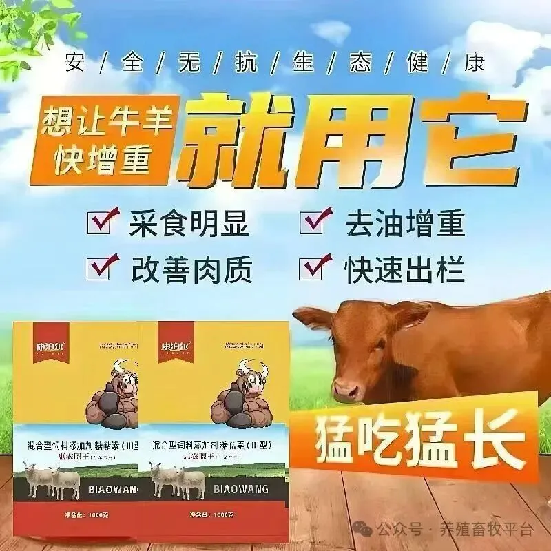 合理添加激素产品和天然植物提取物(胍基乙酸+甜菜碱、克仑巴胺、神肌递能素、氨基丁酸等),克仑巴胺调解动物体内的激素平衡,促进食欲和生长激素的分泌。这些天然的和合理添加产品安全无副作用,能够刺激动物的食欲中枢,让动物更有进食的欲望,同时促进生长激素的分泌,加速生长发育。氨基丁酸的添加,又能使牛羊保持安静,减少应激,使牛羊贪吃贪睡,减少牛羊运动带来的能量消耗,最大限度提高饲料利用率提高产能。胍基乙酸和甜菜碱合理搭配,以及神肌递能素的有效添加可以使牛羊快速合成肌肉,减少脂肪的合成和沉积,以达到健体塑形去油增肌的效果。