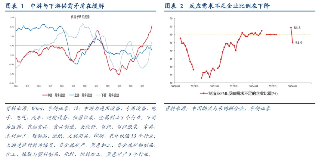 供需矛盾的观察,一方面参见我们构建的需求投资增速差,2025年12月数据表明,12月中游与下游增速差均在进一步上行。其中,中游增速差达到10.4%,前值为8.1%。下游增速差达到1.9%,前值为0.3%。这一指标在1-2年的维度上有助于价格企稳。另一方面,可以观察企业反馈的需求情况。例如,2024年9月26日政治局前,看到的是需求不足的企业比例较多(2024年6月,达到“62.4%”,“2024年8月,比例持续提高,需求不足问题有进一步发展的可能”)。1月,反映市场需求不足的制造业比例降至54.9%,前值为64.3%。