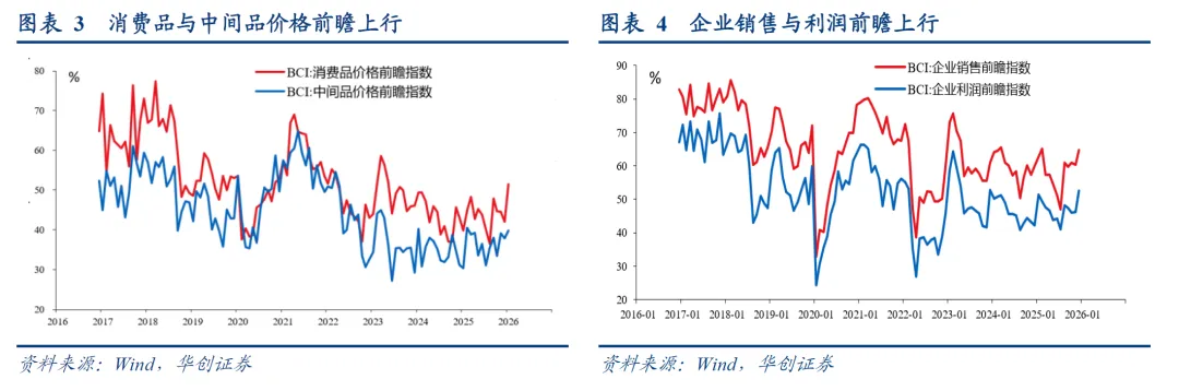 2、BCI调查:1月,BCI消费品价格前瞻指数跃升至51.5%,近28个月首次升至临界点以上。企业利润前瞻指数为52.66%,近11个月首次升至临界点以上。BCI中间品价格前瞻、BCI销售前瞻指标也有所上行。