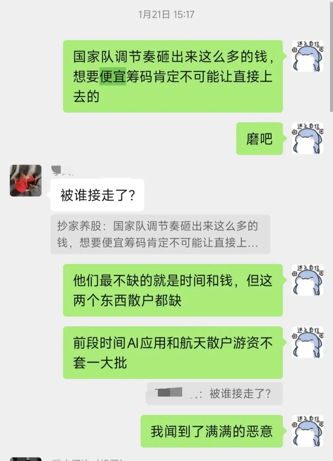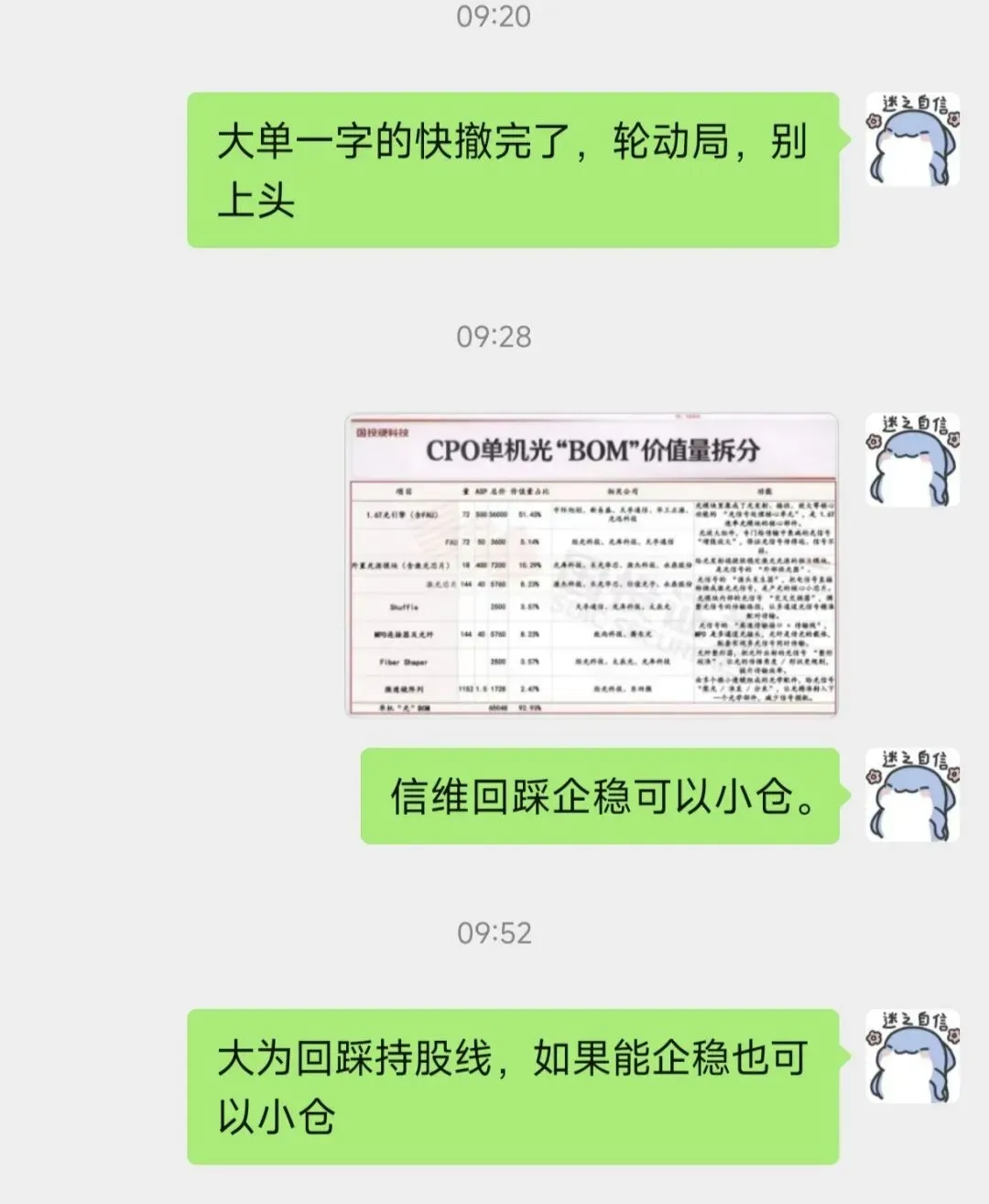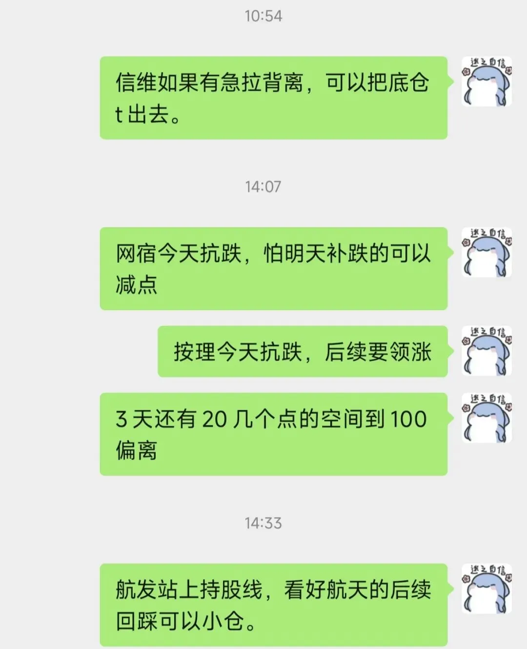 今天早上给的计划也是猥琐谨慎追高,早上凡是冲动追的,无论是你追的什么方向,基本上全挂山顶上,运气不好的就是大回撤。信为全天有护盘收盘微破持股线,大位没有破,都是有逻辑的,按计划来就行,破了持股线第二天不修复走人,以后趋势都是按这个计划来,除非基本逻辑改变。