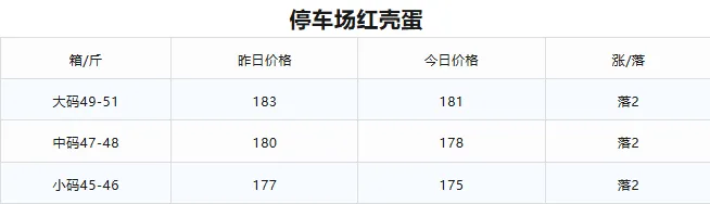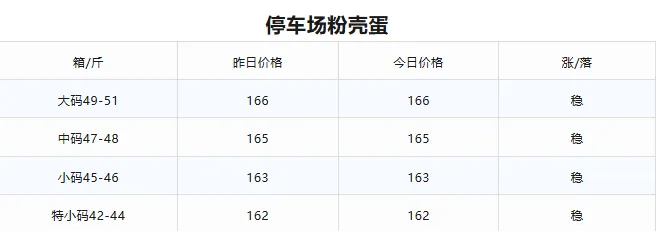 1.停车场粉壳蛋 ;今日各规格价格与昨天持平 保持稳定4.昨日市场成交量全天走货车25辆左右(粉蛋)1号停车场存量67辆(粉蛋)今日到车数量30辆(粉蛋)市场走货情况 目前走货速度正常