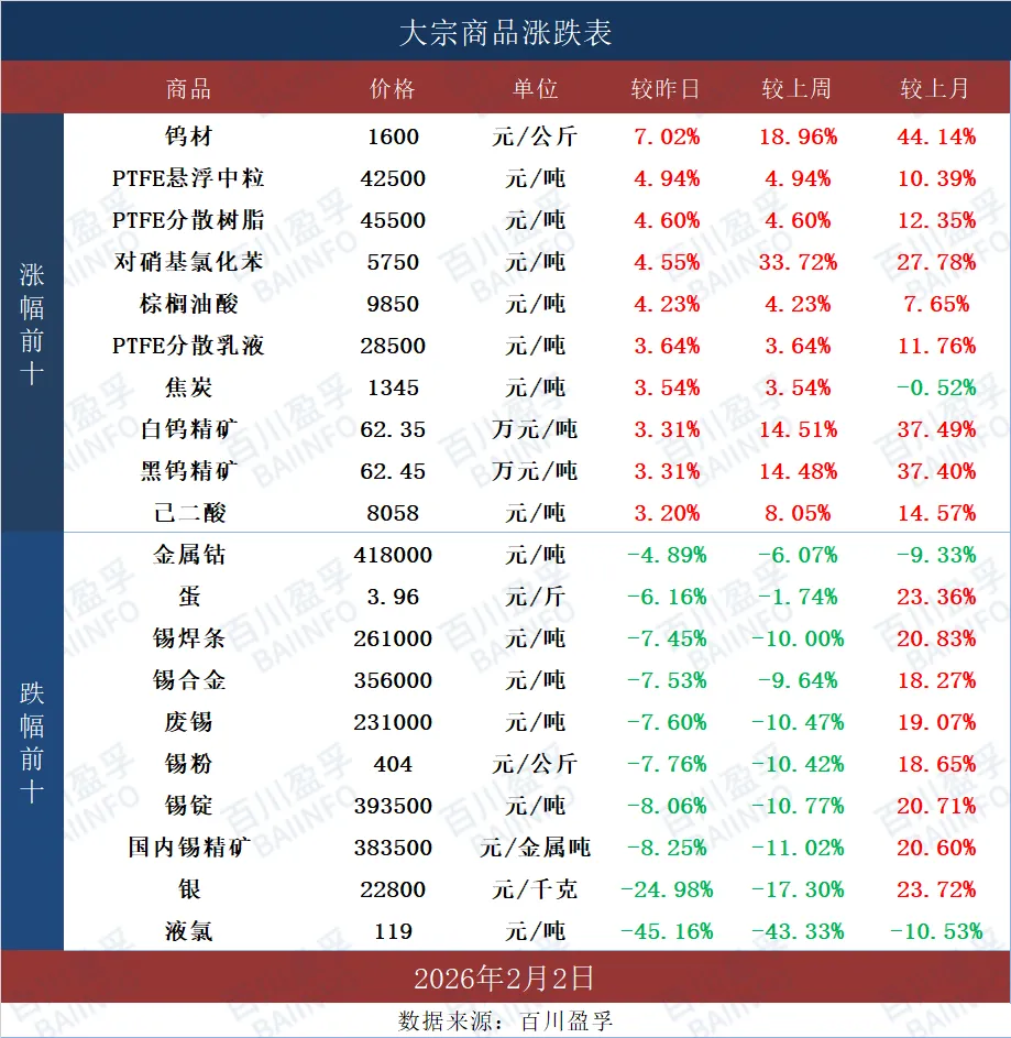 65%白钨精矿价格上调,主流报价在62.3-62.4万元/标吨,较上一工作日上调2万元/标吨。当前钨资源供给约束与战略属性强化,产业链价格继续推高,钨价持续追高,部分持货商报价仍有上探意向,行情不断向下传导。