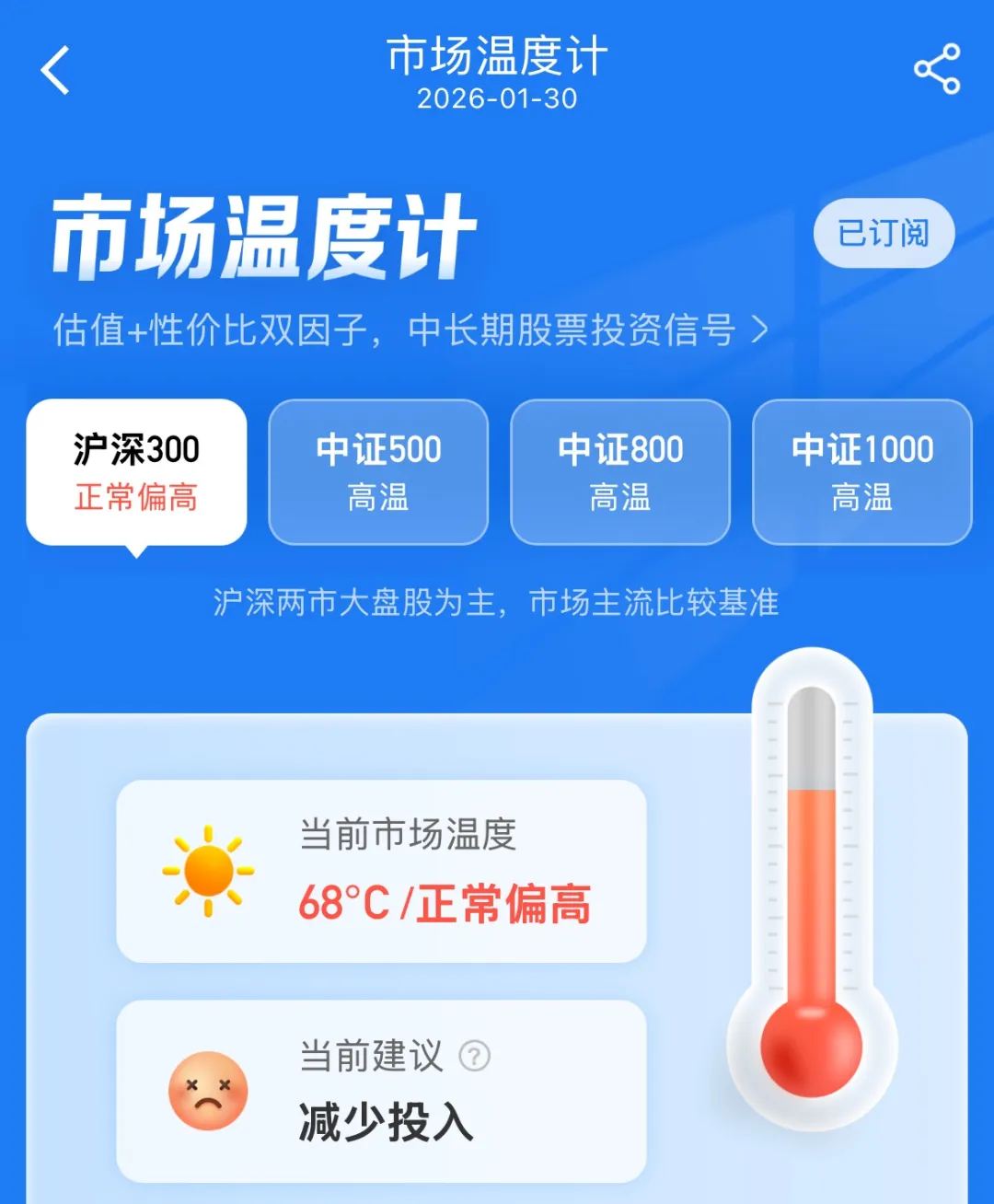 风险提示:中欧财富本着勤勉尽责、诚实守信的原则开展基金投顾业务,但并不保证各投顾组合一定盈利,也不保证最低收益。投资者参与基金投顾业务,存在本金亏损的风险。基金投资组合策略的风险特征与单只基金产品的风险特征存在差异。基金投顾业务项下各投资组合策略的业绩仅代表过往业绩,不预示其未来的业绩表现,为其他投资者创造的收益也不构成业务表现的保证。基金投资顾问业务尚处于试点阶段,存在因试点资格被取消不能继续提供服务的风险。基金有风险,投资需谨慎。以上内容仅供参考,不预示未来表现,也不作为任何投资建议。其中的观点和预测仅代表当时观点,今后可能发生改变。未经同意请勿引用或转载。市场温度计服务的测算数据仅供参考,指数历史业绩不预示其未来表现。文中所用结论仅限于数据测算,是基于一定的假设和指数数据进行的计算,存在局限性。
