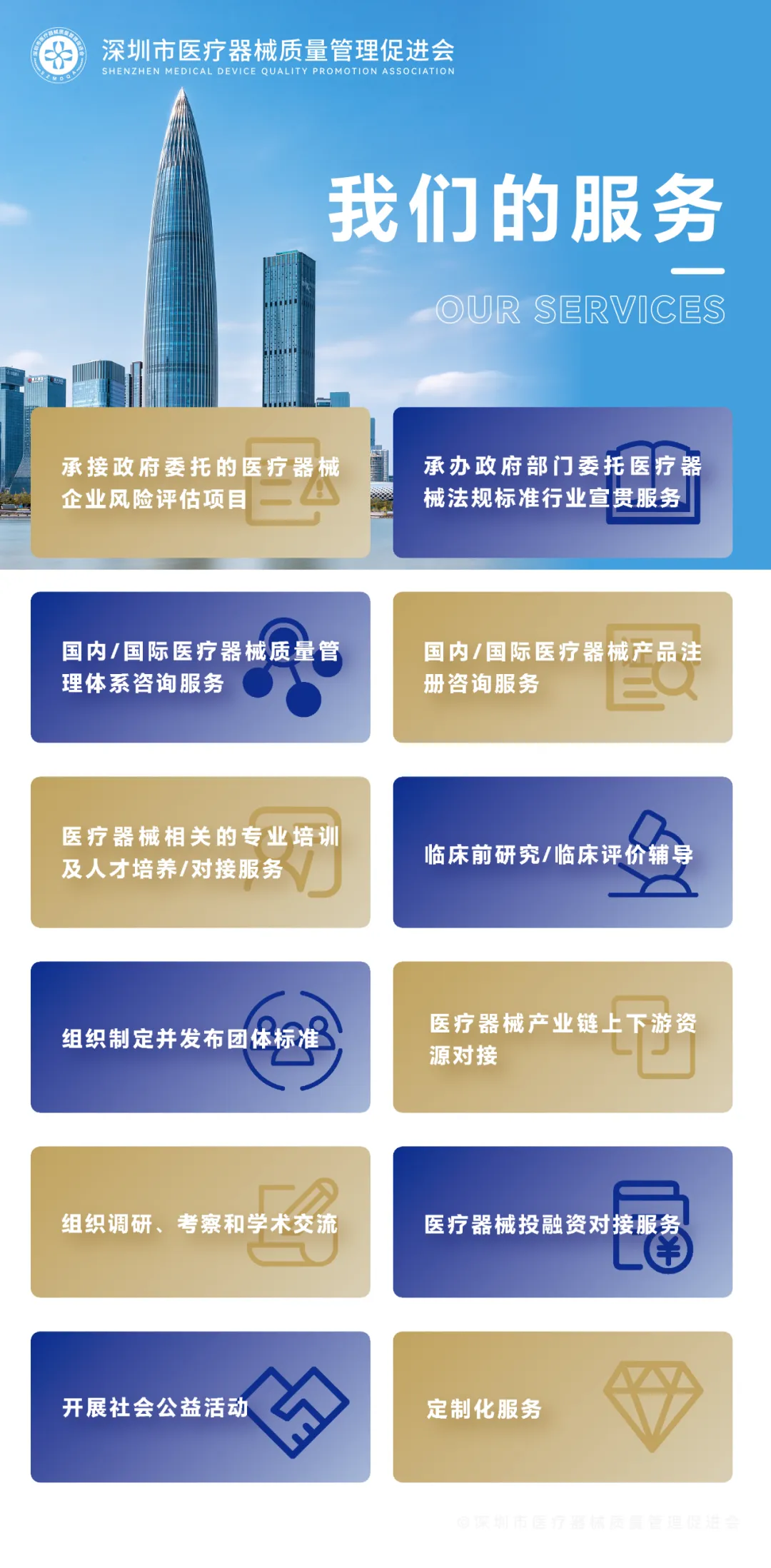 深圳市医疗器械质量管理促进会(简称SZMDQA)成立于2014年,是经深圳市民政局批准,具有独立法人地位的社会团体组织,属于医疗器械行业性、非盈利性的社会团体。
