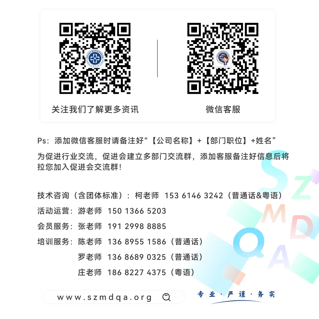 SZMDQA本着“专业·严谨·务实”的核心理念,服务会员,服务行业企业,积极助力企业合规和提升质量管理水平。