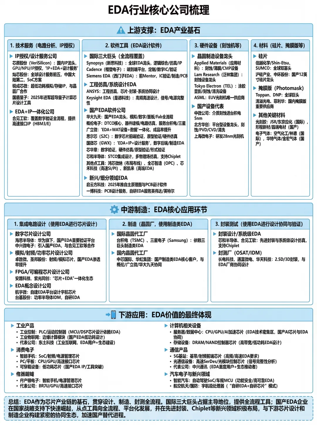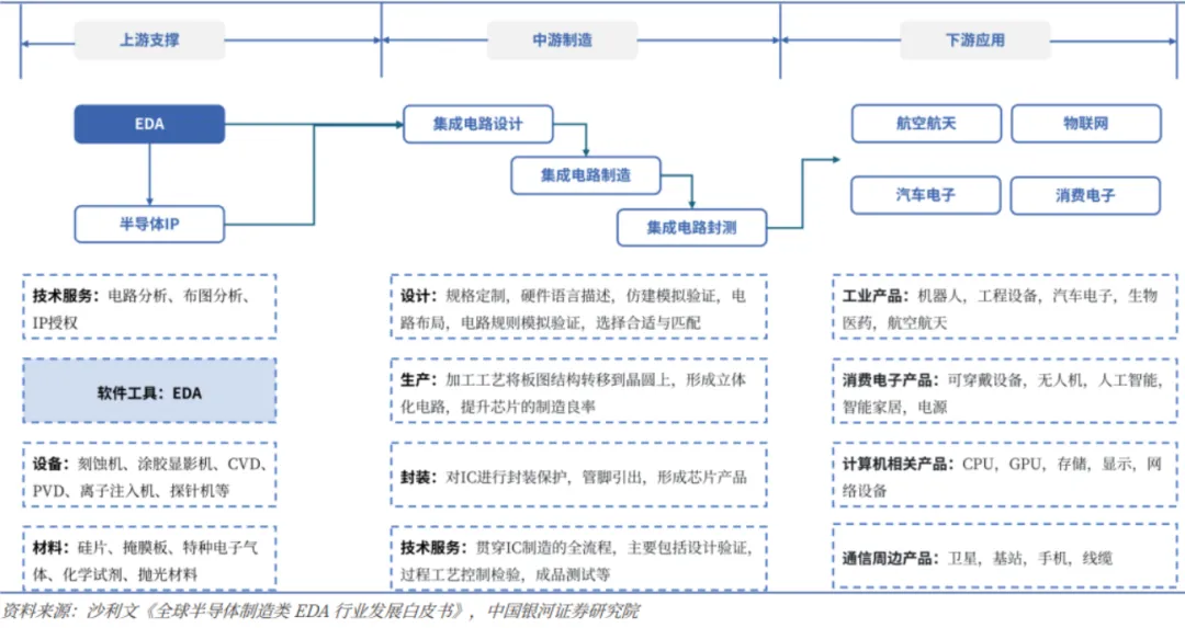 其产业链位置决定了牵一发而动全身的影响力:一旦EDA受限,将直接冲击芯片设计环节,并通过产业链逐级传导,影响整个半导体生态。
