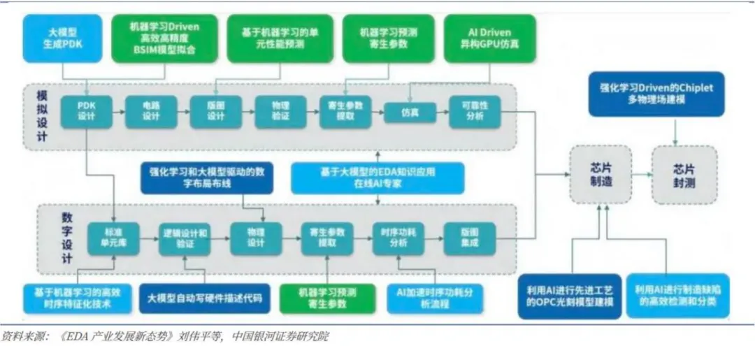 - AI+EDA融合:通过机器学习优化布局布线、加速仿真验证,新思科技、Cadence等龙头已推出全栈式AI驱动解决方案,设计效率提升20%-50%。
