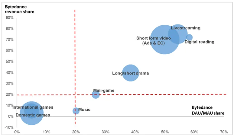 图:字节跳动在不同娱乐细分领域的收入份额