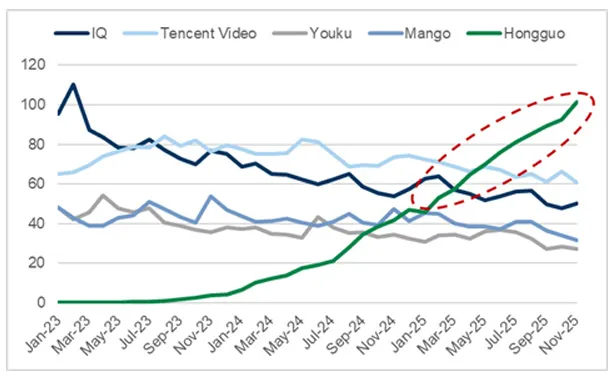 短剧已成为不可忽视的力量。2025年,短剧市场的总规模已接近长视频行业。例如,领先的免费短剧App“红果”的单日活跃用户人均使用时长在2025年达到了125分钟,甚至超过了抖音的123分钟。