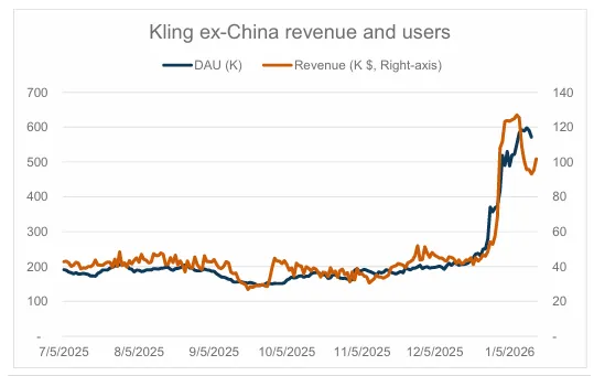 图:Kling在中国以外市场的日流水与DAU趋势