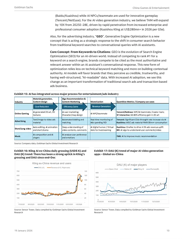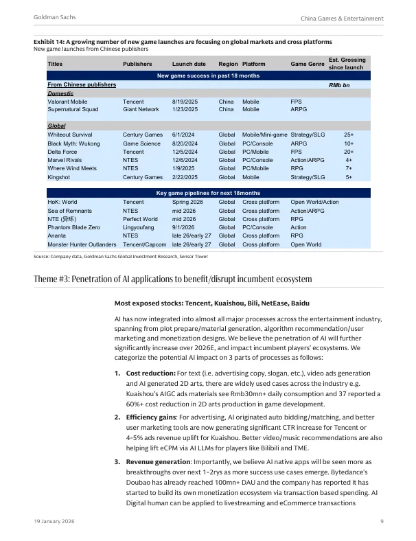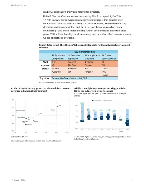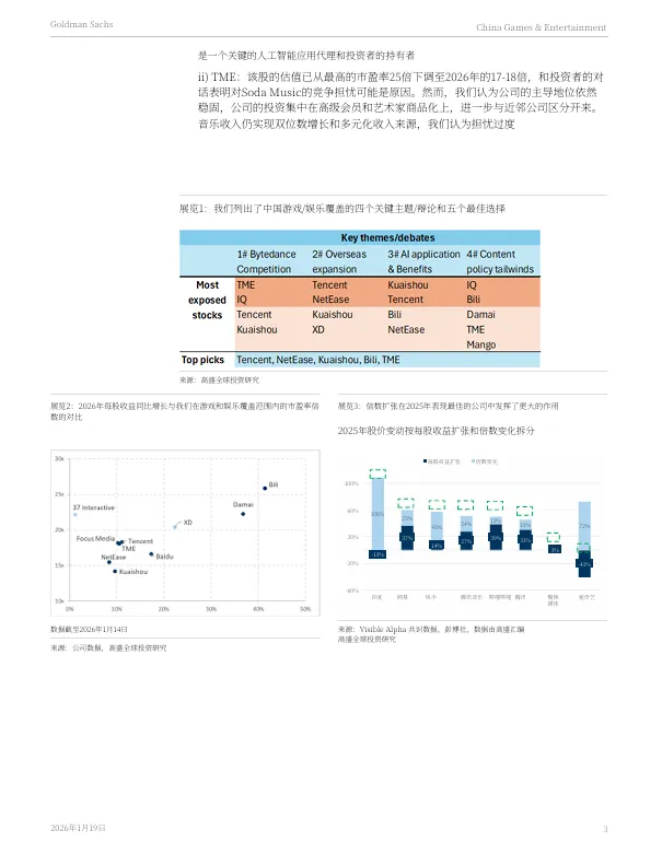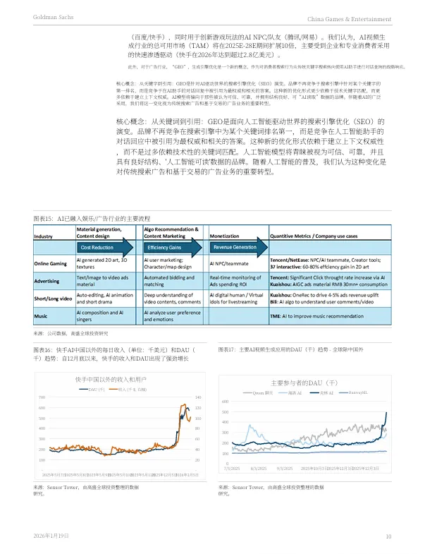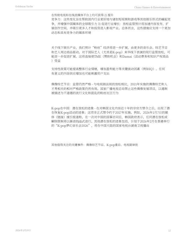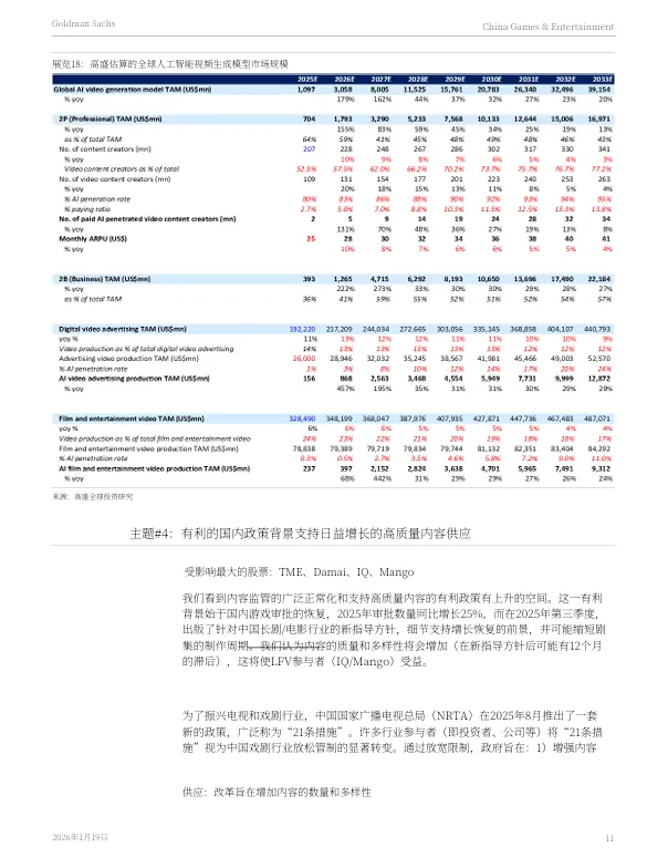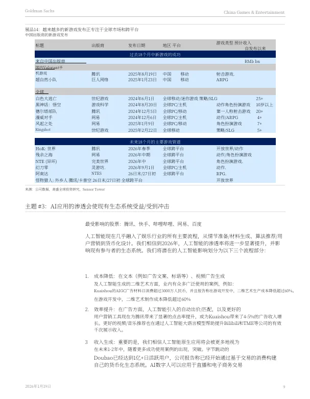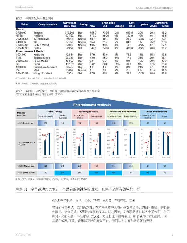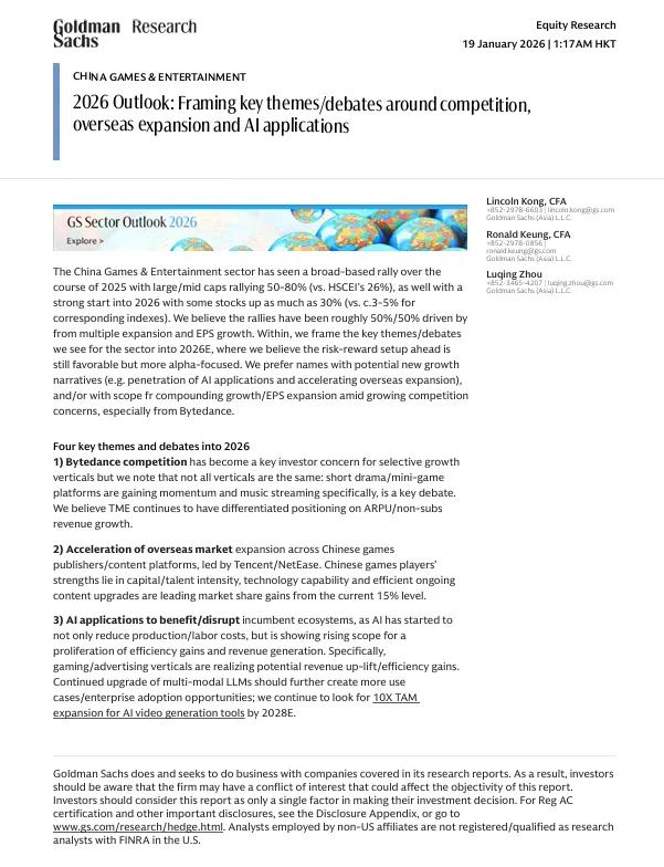 2026年1月19日,高盛发布了《2026年中国游戏与娱乐行业展望:围绕竞争、出海与AI应用构建核心议题框架》报告。报告剖析了中国游戏与娱乐行业在2026年的发展趋势与核心投资主题。
