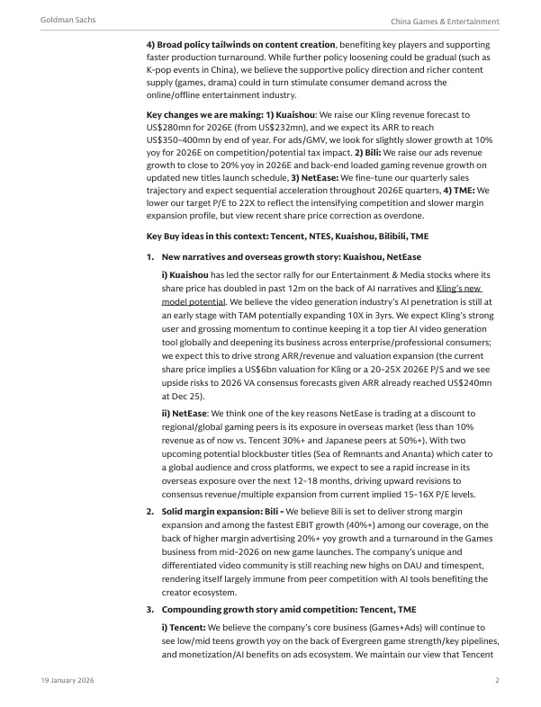 快手是娱乐与媒体板块中股价领先的公司,主要受其AI视频生成模型Kling的潜力驱动。报告将Kling的2026年收入预测上调至 2.8亿美元,并预计其年度经常性收入年底将达到 3.5-4亿美元。