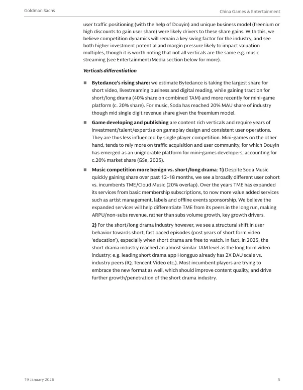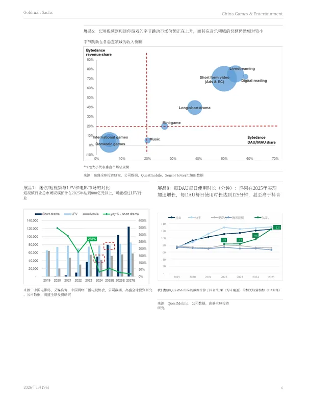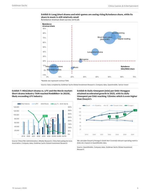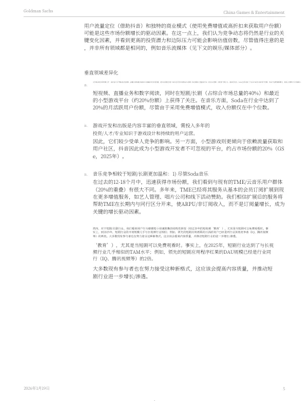 大型游戏的开发与发行是内容密集型产业,需要长期的投入、人才积累和运营经验,因此受单一竞争者影响较小。而小游戏则更依赖流量获取和用户社区。报告指出,抖音已成为小游戏开发者不可忽视的平台,占据了约 20% 的市场份额(高盛估算,2025年)。