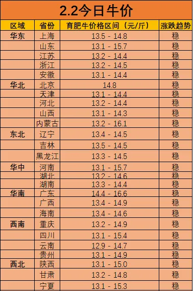 整体概况:今日全国育肥牛价格整体稳定。全国主产省活牛均价为26.72元/公斤(约13.36元/斤),环比上涨0.4%。从区域看,广东、上海、北京等主要消费市场的价格相对较高,而山东、河南等主产区的价格则出现小幅上行。