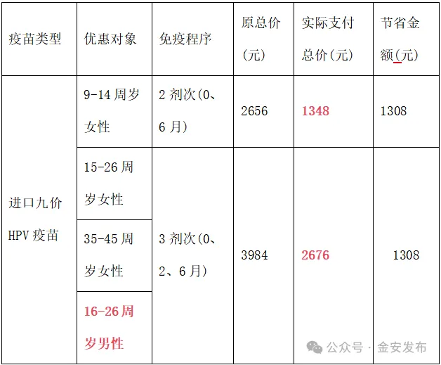 2、16-26周岁男性、15-26周岁及35-45周岁女性按照“0、2、6月”接种程序在上述规定时间内完成首针及全程接种,减免第3剂疫苗费。原总价3984元,优惠后总价2676元(首剂1328元,第二剂1328元,第三剂仅支付接种服务费20元)。