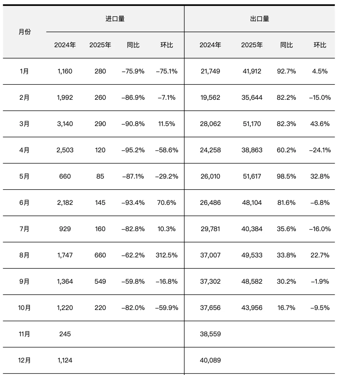 从月度数据来看,2025年中国TDI出口呈现“持续高位、屡破纪录”的态势。11月出口量达5.65万吨,创下单月出口历史最高值;12月出口量保持高位,达5.02万吨,延续强劲势头;1-10月累计出口44.98万吨,同比增长56.2%,为全年出口创纪录奠定基础。进口方面,2025年10-12月进口量持续低迷,10月进口220吨、11月460吨、12月140吨,同比均大幅下滑,2025年1-10月累计进口2769吨,同比减少83.6%。