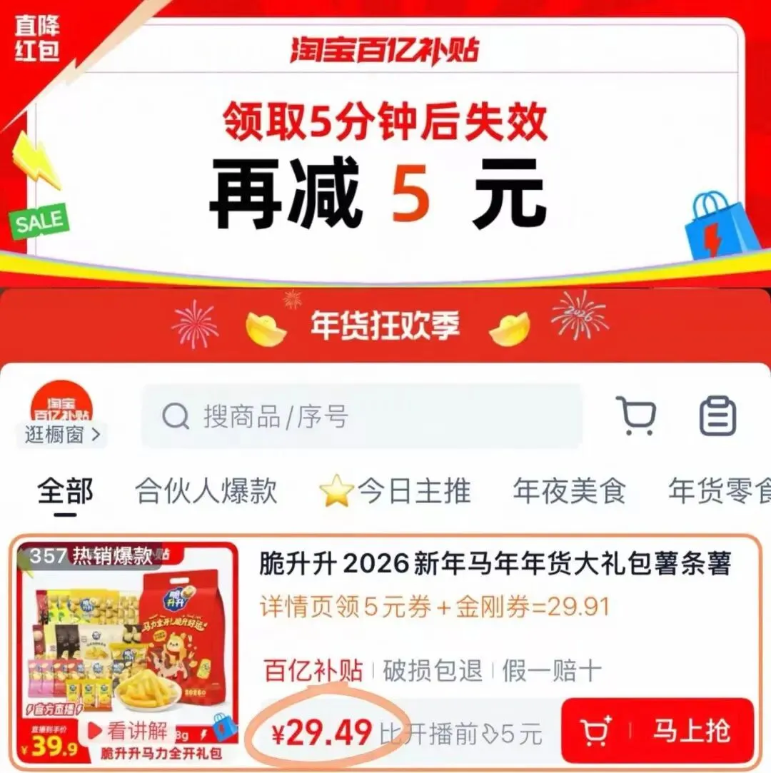 脆升升 马年大礼包528g,先领标题下方金刚券!下拉详情页领-5亓荭包!跳转页面到直播间下单!只要💰29.9!