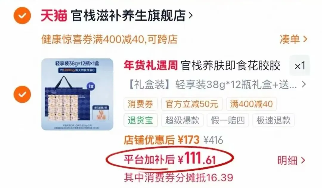 官栈 即食花胶(白桃乌龙)38g*12瓶+花胶羹150g*3碗!详情页领-40亓健康券!到手💰128!凑消费券低至💰112!才合7.4/件!
