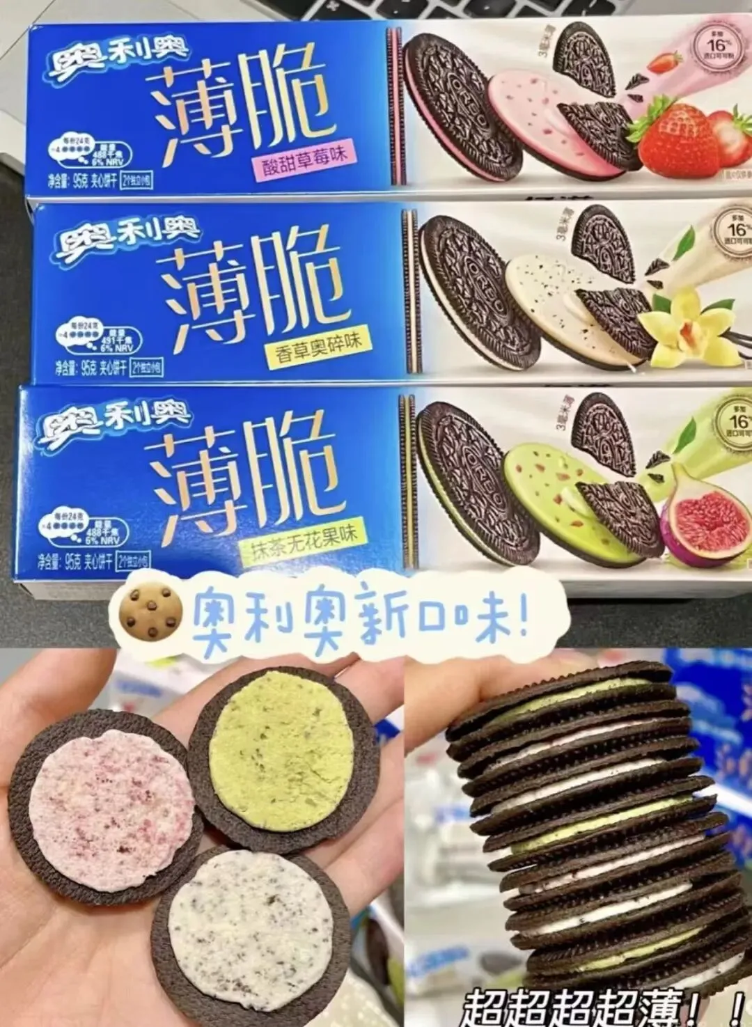 黑巧+草莓+香草+抹茶无花果等6味都有!每片只有3毫米薄!夹心很浓郁,也不甜腻,平时当充饥小零食也可!