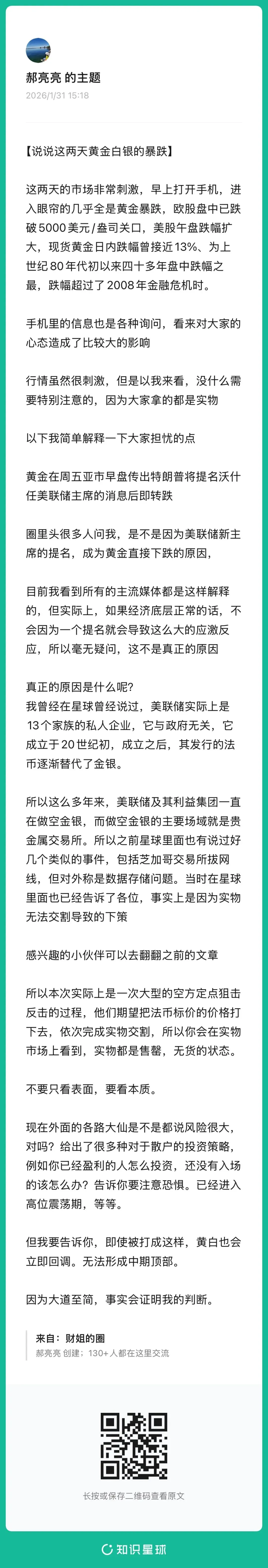 发一个1月31日上周五黄金白银大幅下跌之后在星球中分享的文章https://t.zsxq.com/DZNiG