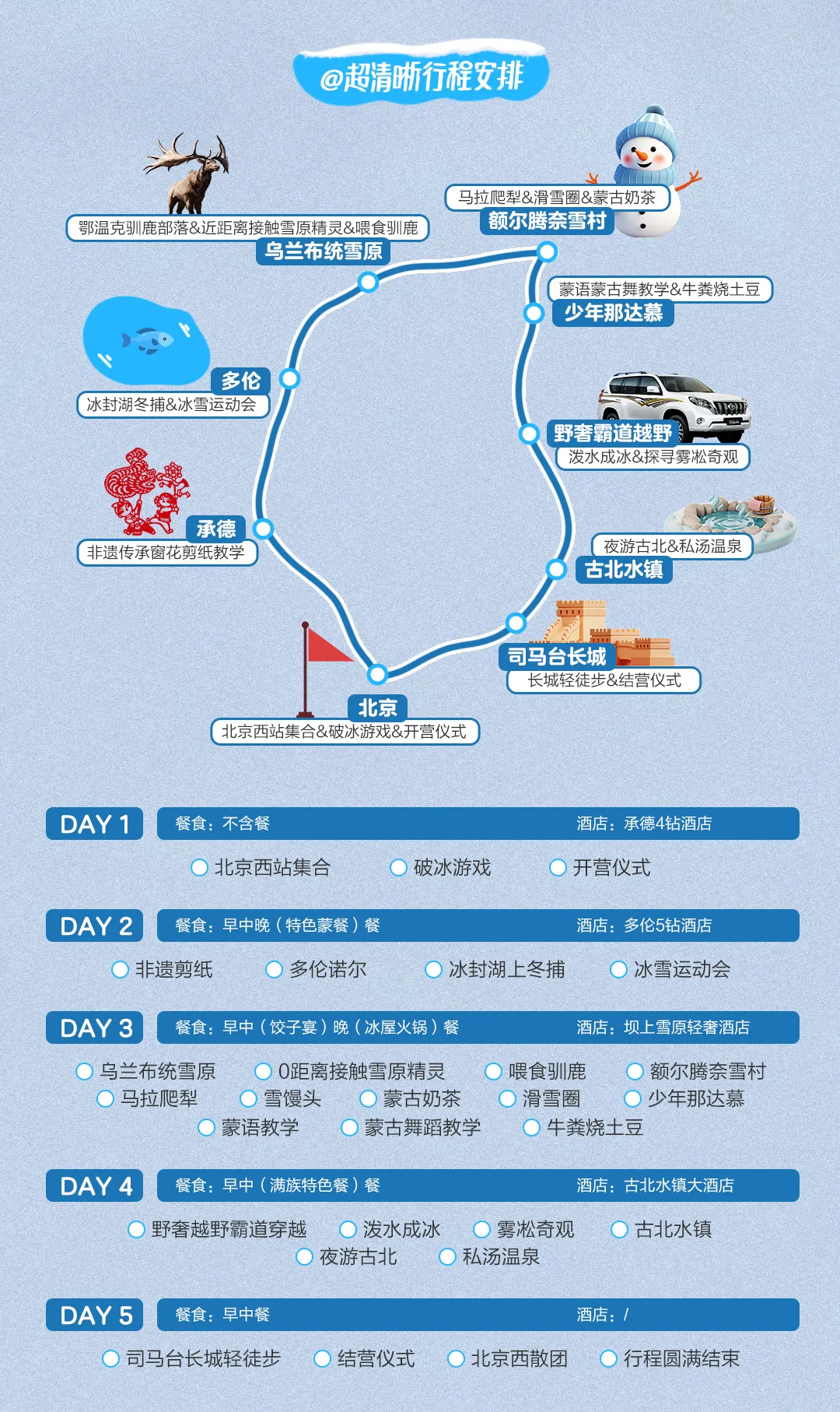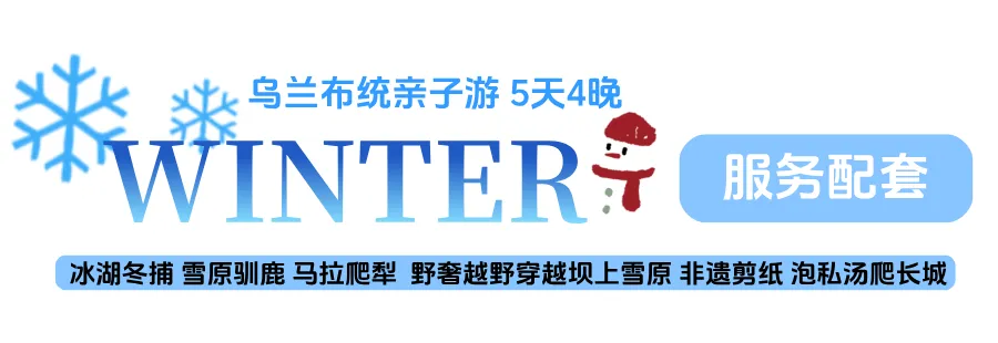 3、特色活动:多伦冰封湖上冬捕/冰雪运动会/原始丛林雪地追踪/丰田霸道越野车雪乡穿越/马拉爬犁 额尔腾奈雪村 蒙古名俗 /承德非遗剪纸/雪原训鹿