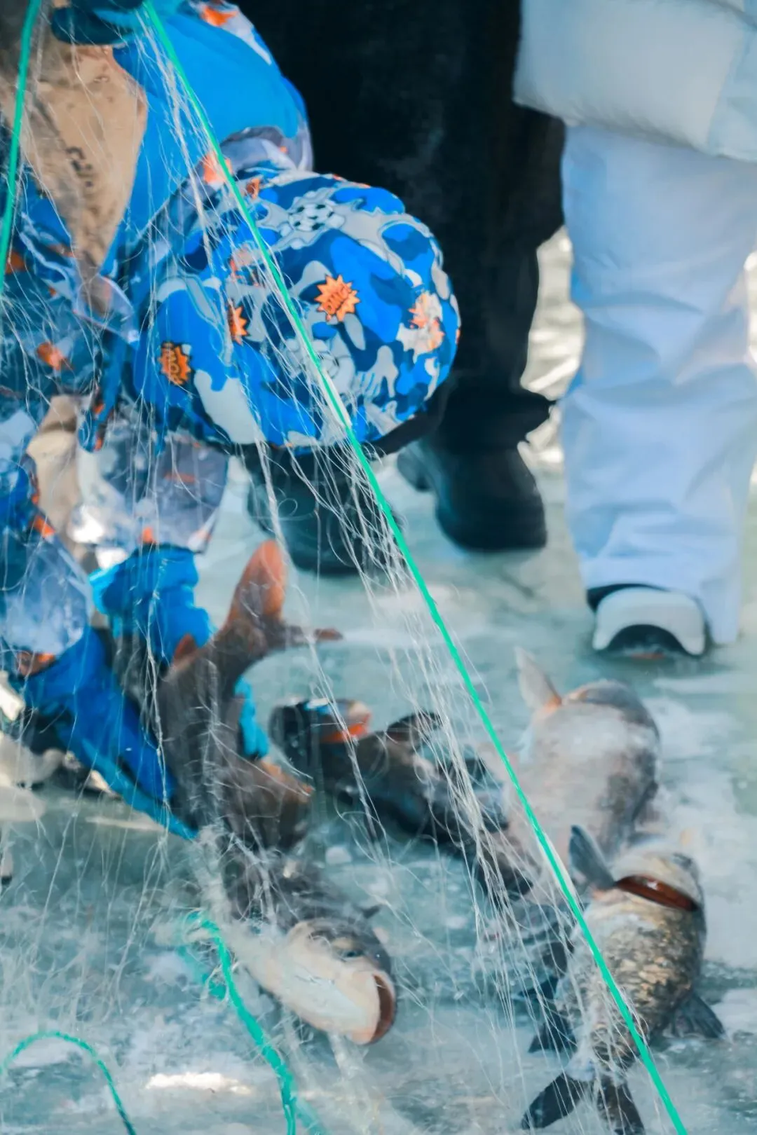 经过一番满怀期待的等待,渔网从冰洞中缓缓收起。一尾尾鲜活的鱼儿跃出水面,瞬间便被寒冷的空气定格。这一刻,收获的喜悦仿佛融化了整个冰封的冬季。