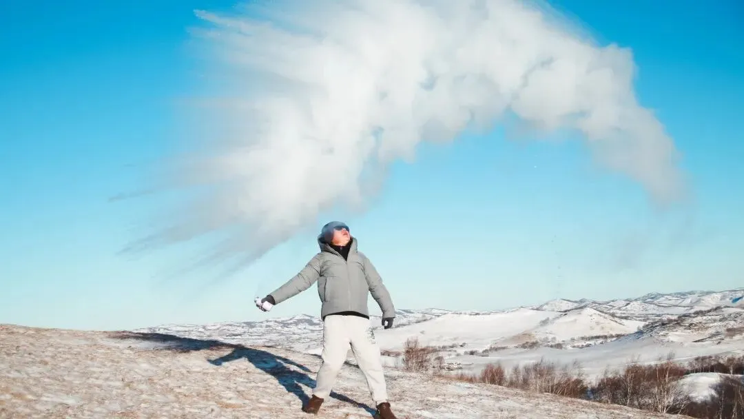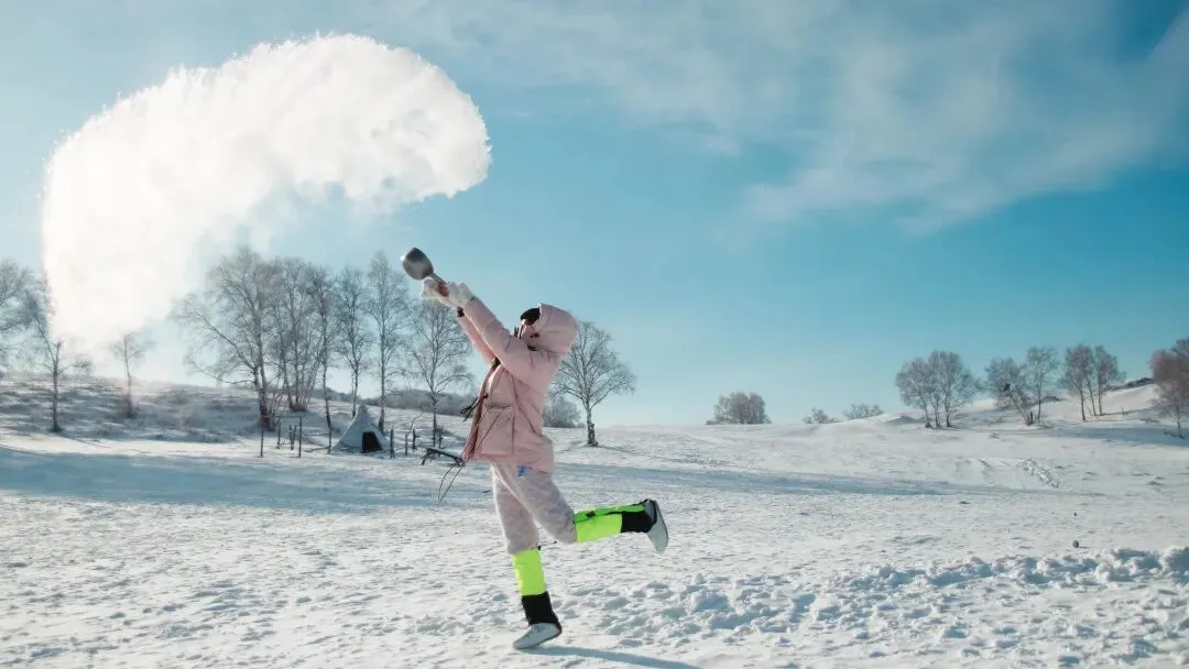 体验泼水成冰,-15℃才能解锁的酷玩成就,感受雪国冬日的绚烂水蒸气迅速降温凝华的原理 大小朋友们比一比谁的抛物线更华丽吧