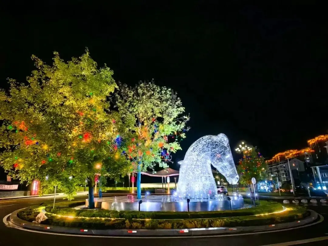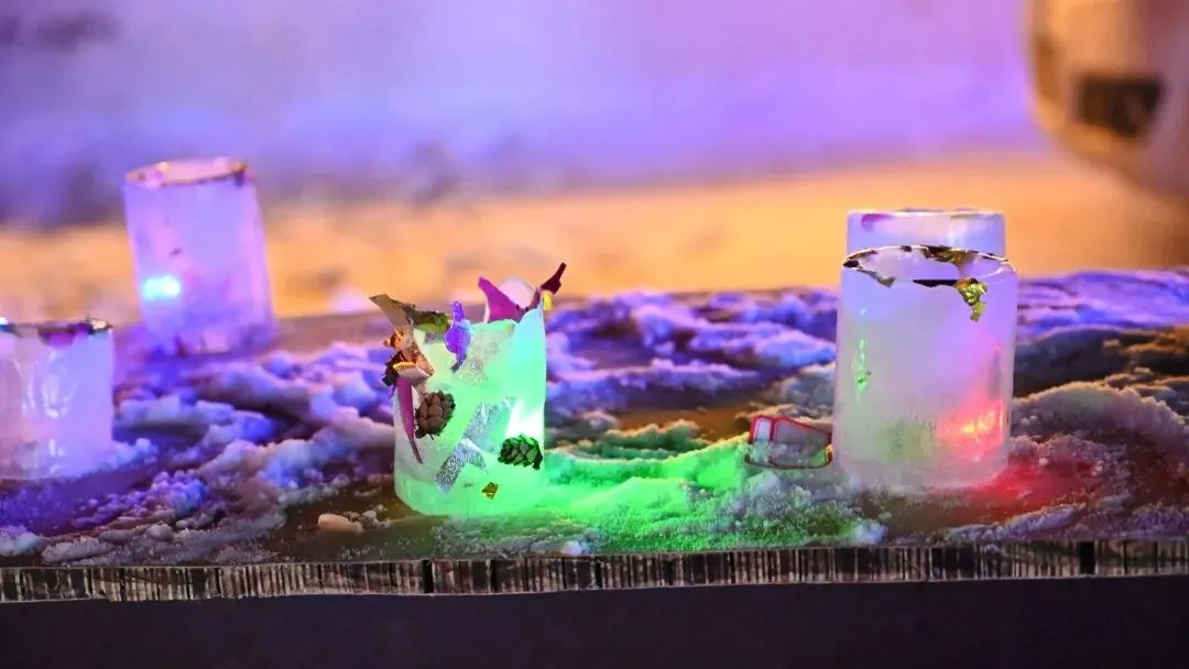 将LED灯或烛火放入成型的冰灯,在暮色降临时共同点亮,灯光在冰晶中缓缓亮起,如同一颗被冻结的星星。